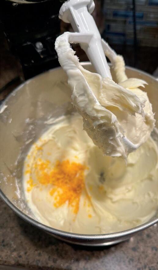 Mix in sifted powdered sugar, 1 cup at a time. Add orange zest and orange extract and mix until smooth.