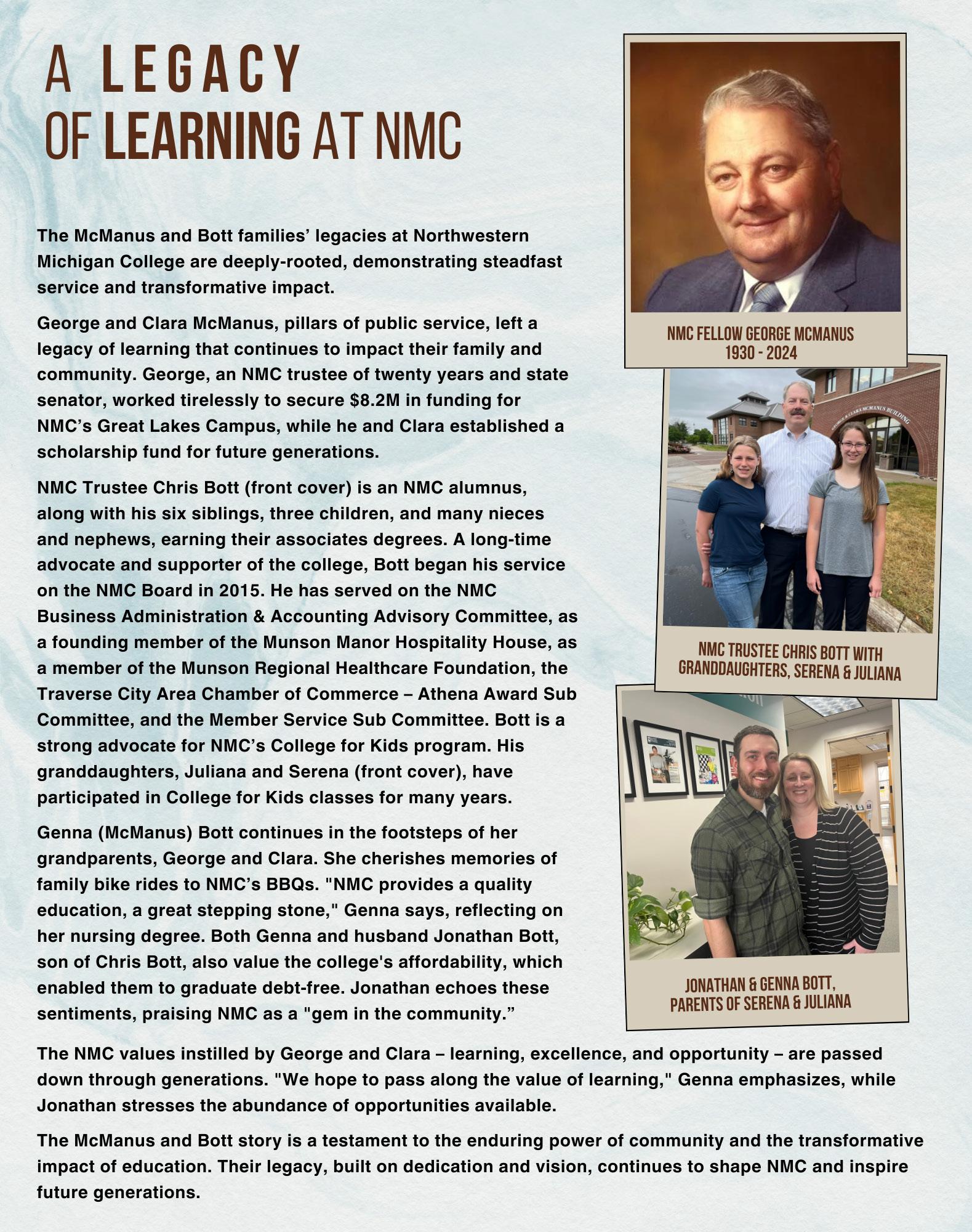 NMC is more than a college; it’s a legacy. From George and Clara McManus, to NMC Trustee Chris Bott and his granddaughters Juliana and Serena Bott, the stories are deeply rooted and extend into the future. Jonathan Bott and his wife, Genna, share memories of growing up at NMC, attending BBQs and College for Kids, and earning their degrees. Now, their daughters attend College for Kids. Last summer, Juliana and Serena took America’s Boating Course at the Great Lakes Campus, in a building named for great-grandparents, George & Clara McManus. For more on this family’s legacy of learning, see page 11.