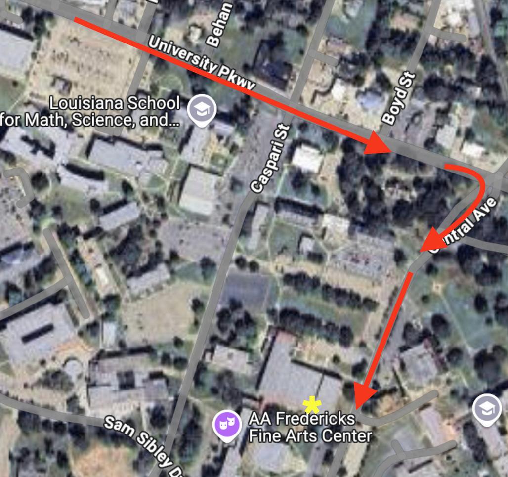 From I-49, travel east on University Parkway until you reach the NSU campus. Turn right on to Central Avenue and continue to proceed south. About ¼ mile, CAPA is on your right hand side, however, parking will be in the lot on the left (see street-level map below.)