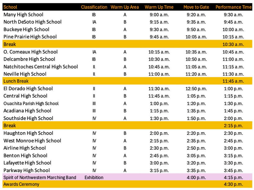 Bands are scheduled according to classification, based on band size (marching winds/percussion). Every effort has been made to schedule bands from the smallest classification to the largest; however consideration is given for travel and events that may ordinarily prohibit a band’s performance (ACT, etc.)