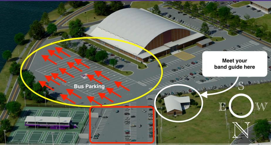 Once your bus is parked, you will check in at the Alumni Pavilion, receive a welcome packet, and meet your band guides.