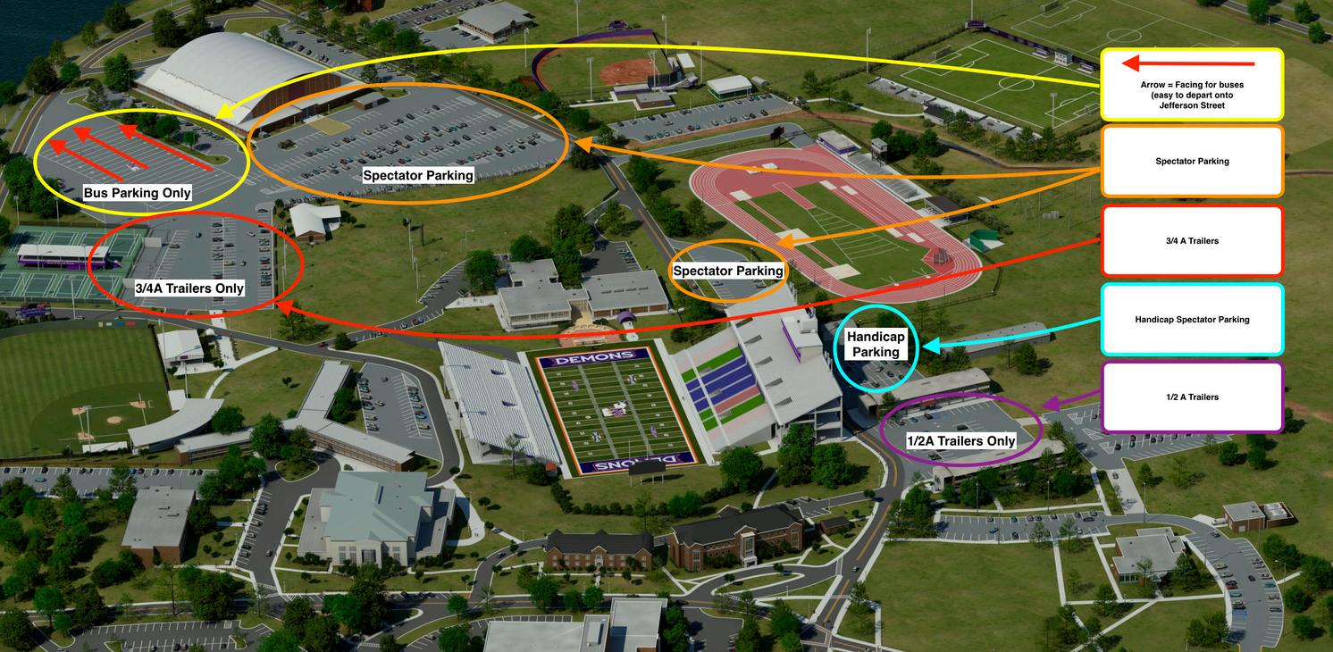 Your Classic on the Cane band guide will reach out to you before your arrival on campus, the day of our event. Once you enter Northwestern State University via the Caspari entrance, please continue south. You will come to a 4-way stop sign and continue straight ahead (page 6). Please use the map on Page 7 to guide you to the Director Check-In. You will pass behind the home side of the stadium on your left. Continue driving straight and make your first left-hand turn into the Prather Coliseum Parking Area. The Director Check-In location will be at the Alumni Plaza. This location is circled in white. Once you arrive at Director Check-In, please pick up your packets, which will include a COC Program, wristbands for your staff/parent volunteers, etc..
