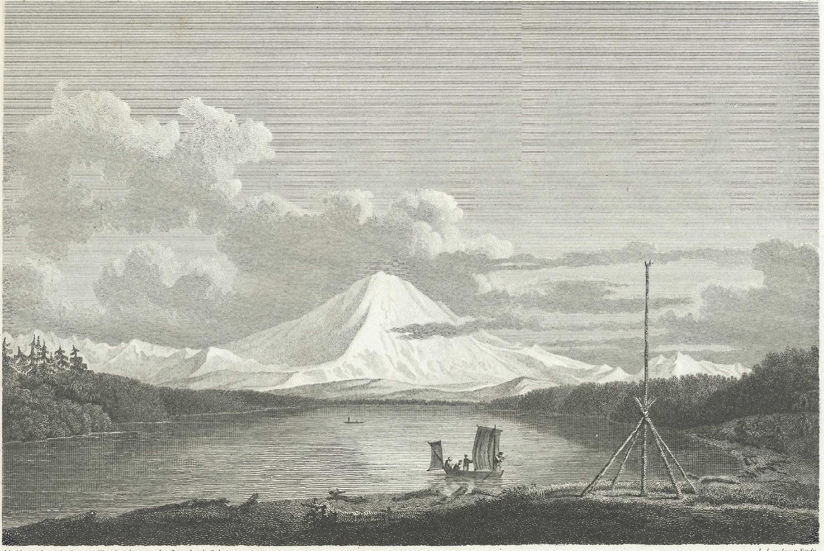 Etching of view of Mount Rainier from South part of Admiralty Inlet (1798)