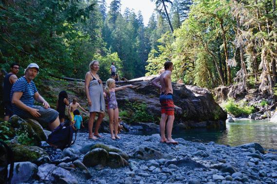 8. Rocky Brook Falls (QUARTER MILE – EASY) Brinnon | Milepost 306 on US 101, Dosewallips Road 3 miles Private, no pass, kid/dog-friendly - check for closures FJORD FJORD 70 58 Classic horsetail waterfall crashes more than 200’ from hanging valley. Summer, the cascade pool is a popular swimming hole.