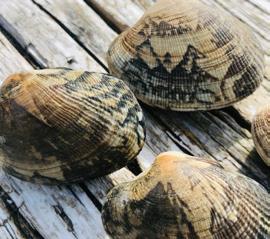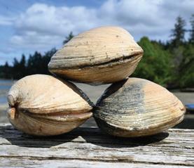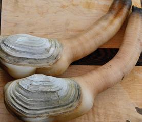 Up to 10”, 2.5 – 10 lbs. Gaping oblong shell with concentric rings; white shell with flaky brown skin; siphon and mantle are too large to withdraw; found at depth of 2-3’ in mud, sand, gravel in the subtidal zone (extreme low tides).