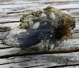 Blue Mussel (native) up to 3”, California Mussel (native) up to 6”, Mediterranean non-native) up to 5”. Oblong shell, blueblack or brown, attaches to rocks, pilings, boats, gravel, or other hard surfaces in the intertidal zone with bissel threads.