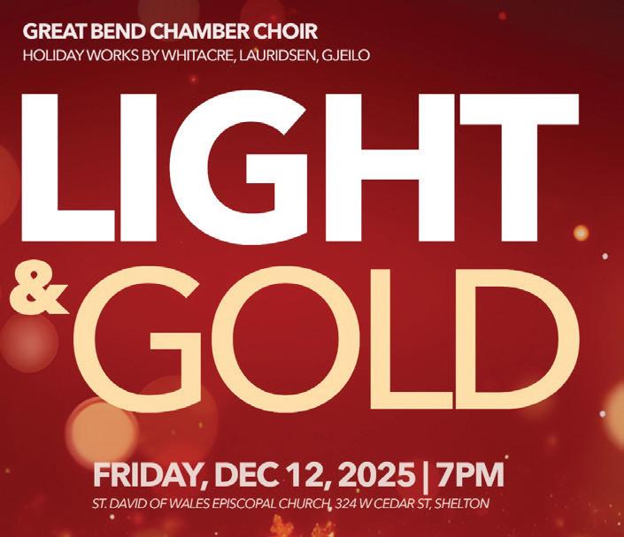 Join the Great Bend Chamber Choir for Light & Gold, a warm and glowing holiday concert featuring music by Whitacre, Lauridsen, Gjeilo, and more. Enjoy four beautiful settings of O Magnum Mysterium and the shimmering Lux Aurumque, all performed by candlelight in the cozy space of St. David’s. A perfect way to slow down and savor the season. Tickets: $16 General, $12 Senior/Military, Free for Season Pass holders. More info: greatbendmusic.org.