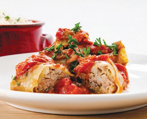 Remove core from cabbage. In large pot of boiling salted water, cover and cook cabbage for 8- 10 minutes or until leaves are soft. Chill in cold water. Carefully remove 12 leaves, returning cabbage to pan for 2-3 minutes if leaves are difficult to remove. Drain on towels. Pare off coarse veins and set aside.