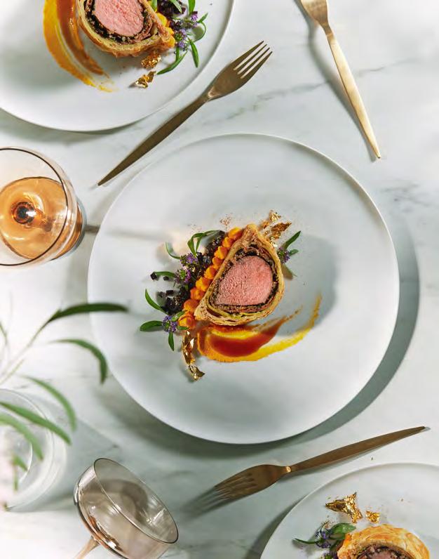 Klassisk Beef Wellington med gulrotkrem og kalvejuice.