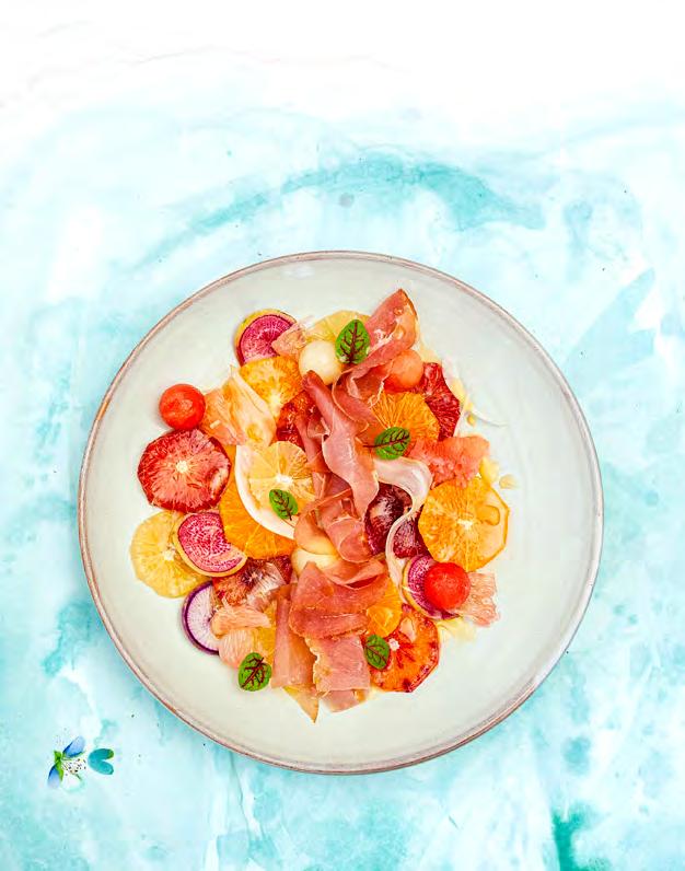 Melon- og sitrussalat med krydret spekeskinke fra Tynset. Bakeri- og kaféfristelser