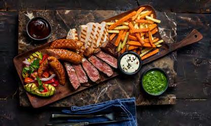 Grillplanke med Salsiccia, Ungfe striploin, kyllingbryst, grillet avokado, fries og 3 sauser.