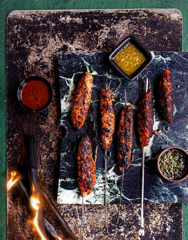 Form deigen til avlange kjøttboller (ca. 3x5 cm – ca. 35-40 g per stk.) rundt et grillspyd. Pensle spydene med BBQ-saus. Grill på medium varme i ca. 10 minutter.