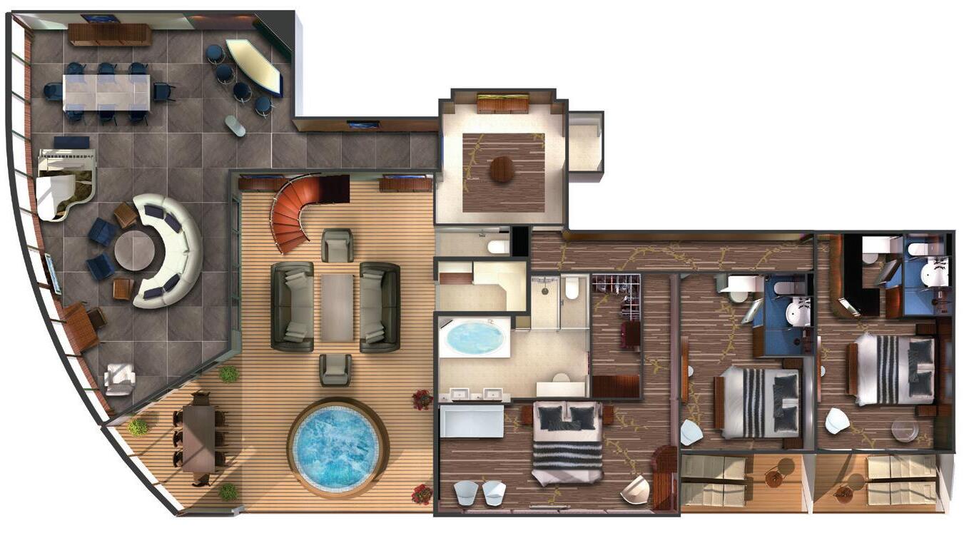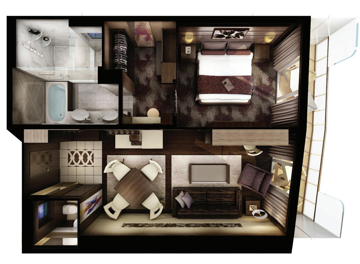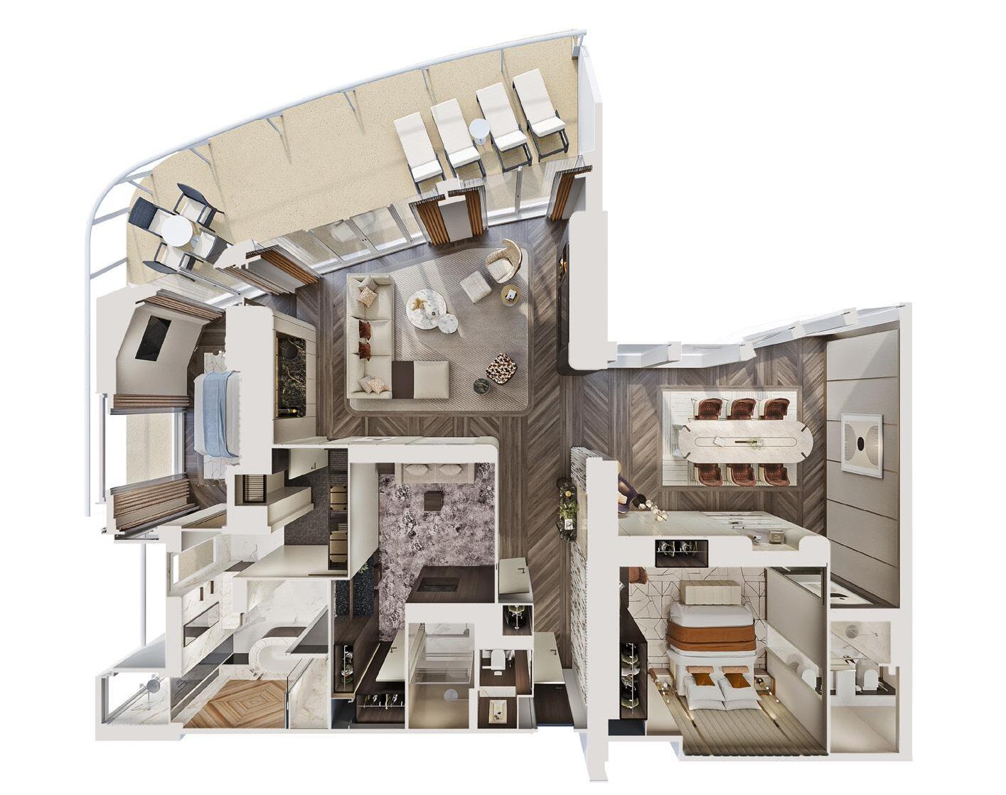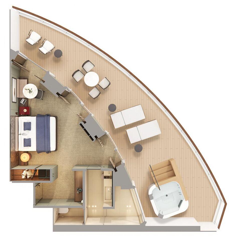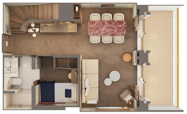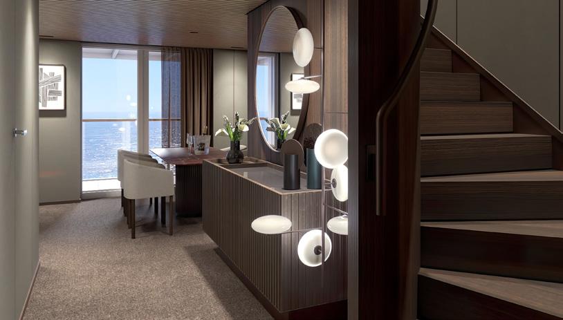 Descubra nossa primeira Suíte Duplex a bordo do novo Norwegian Aqua. Projetada com uma atmosfera elegante, porém descontraída, é um oásis idílico à beira-mar após um longo dia de exploração. As portas deslizantes do chão ao teto se abrem para uma varanda privativa de grandes dimensões com vistas deslumbrantes do horizonte, enquanto a sala de estar e as salas de jantar separadas oferecem isolamento adicional e espaço para se espalhar.