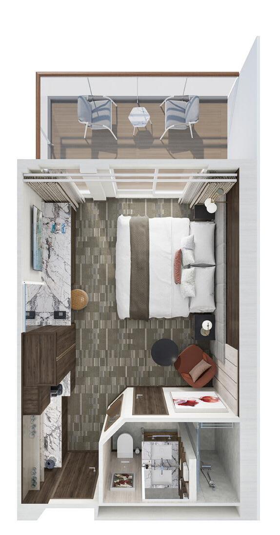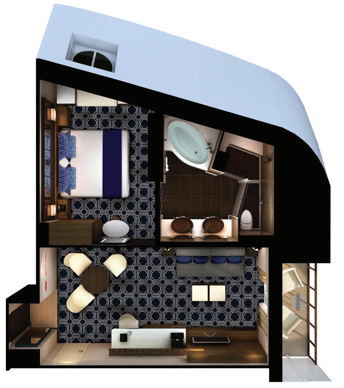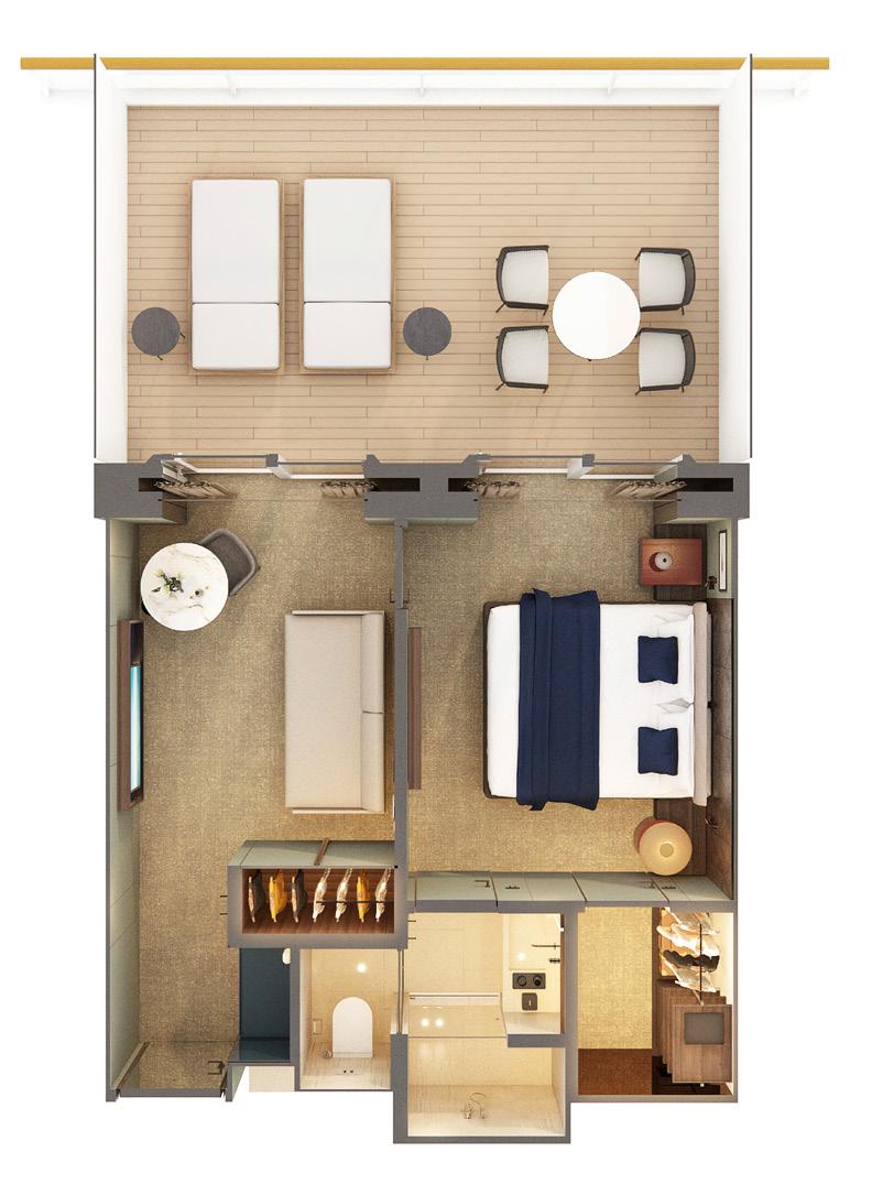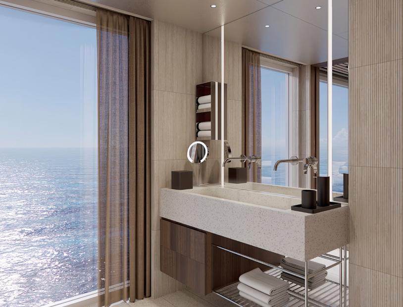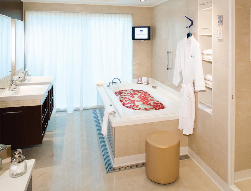 O luxo nunca foi tão acolhedor e refrescante. Entre em sua espaçosa suíte, Penthouse ou Family Villa e relaxe com total conforto. Desfrute das impressionantes janelas do chão ao teto que proporcionam vistas da paisagem marítima em constante mudança ou saia para a sua varanda privativa e sinta a calma da relaxante brisa do mar. O belo mármore cobre o banheiro, que inclui uma banheira de hidromassagem com vistas igualmente incríveis.