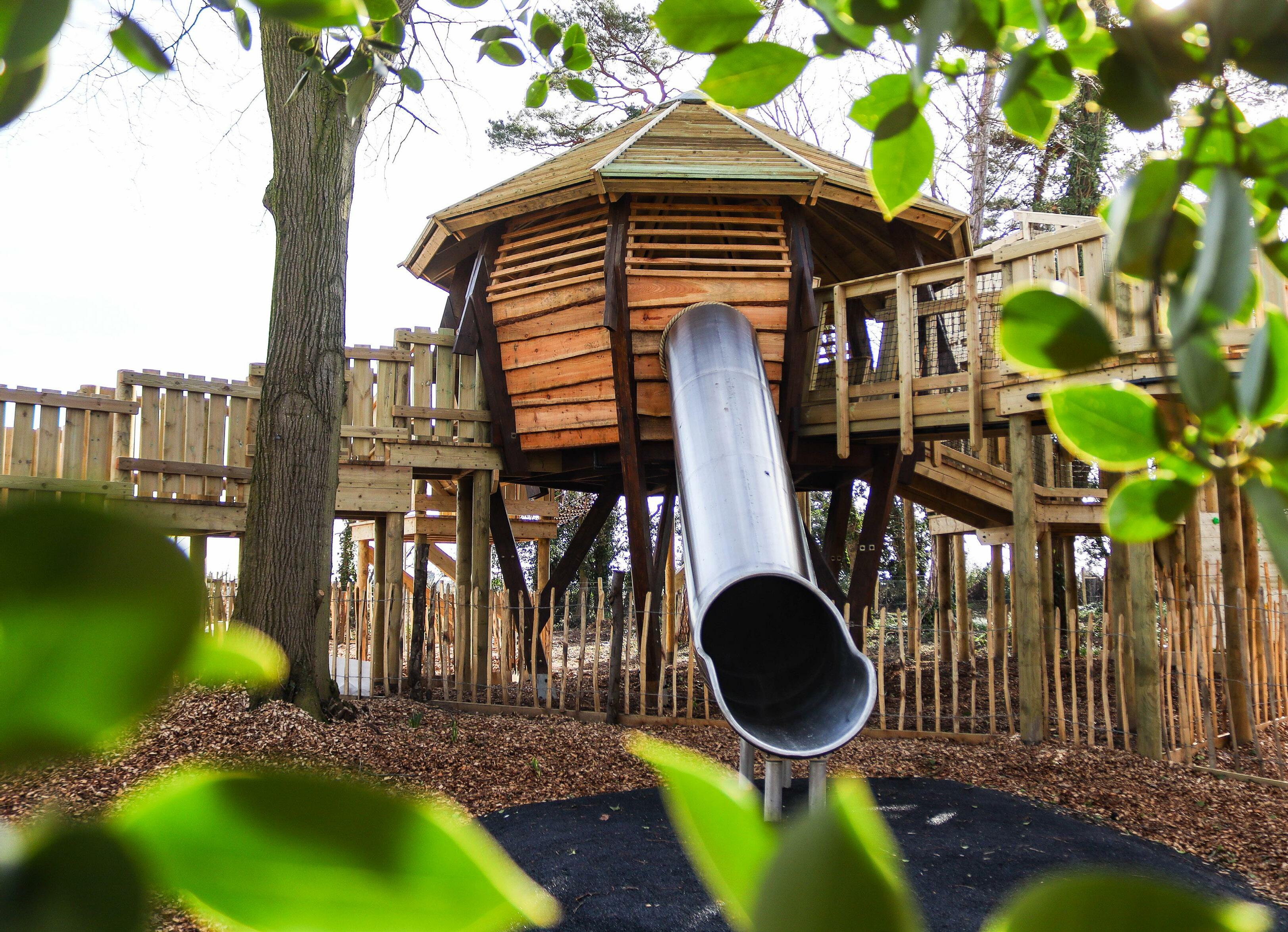 Raised walkways, treehouse, ladders, ropes, swings, slide & climbing wall