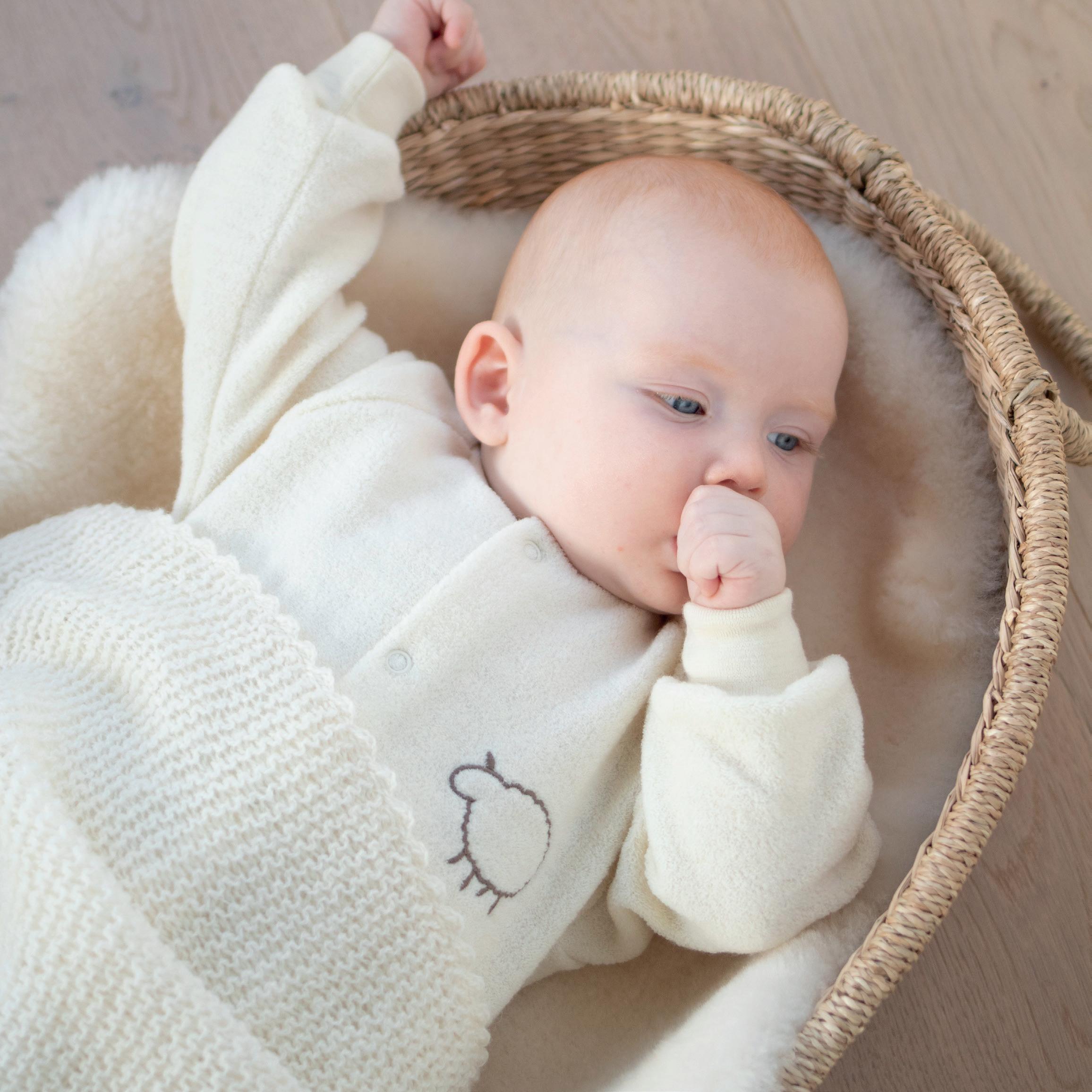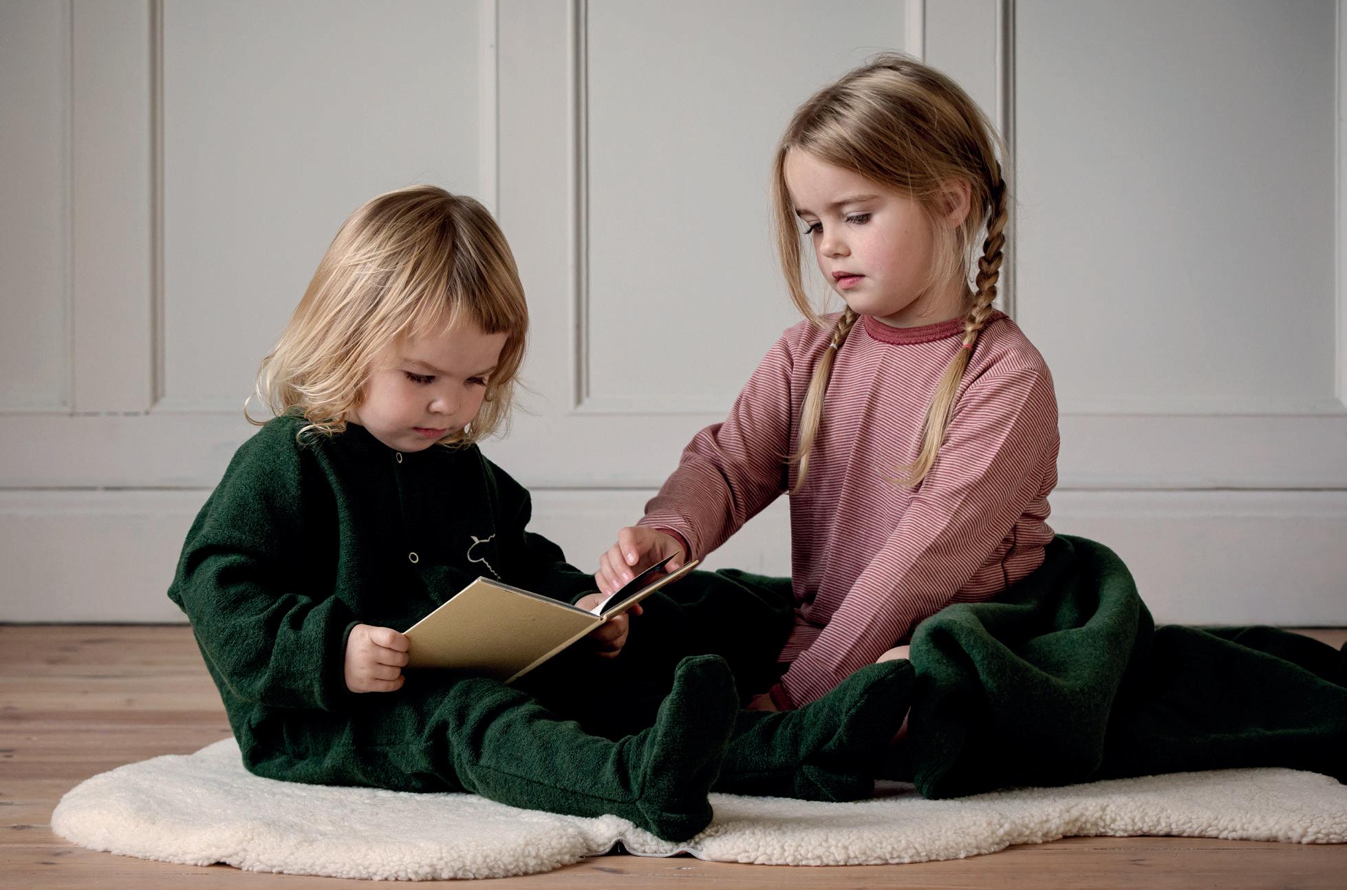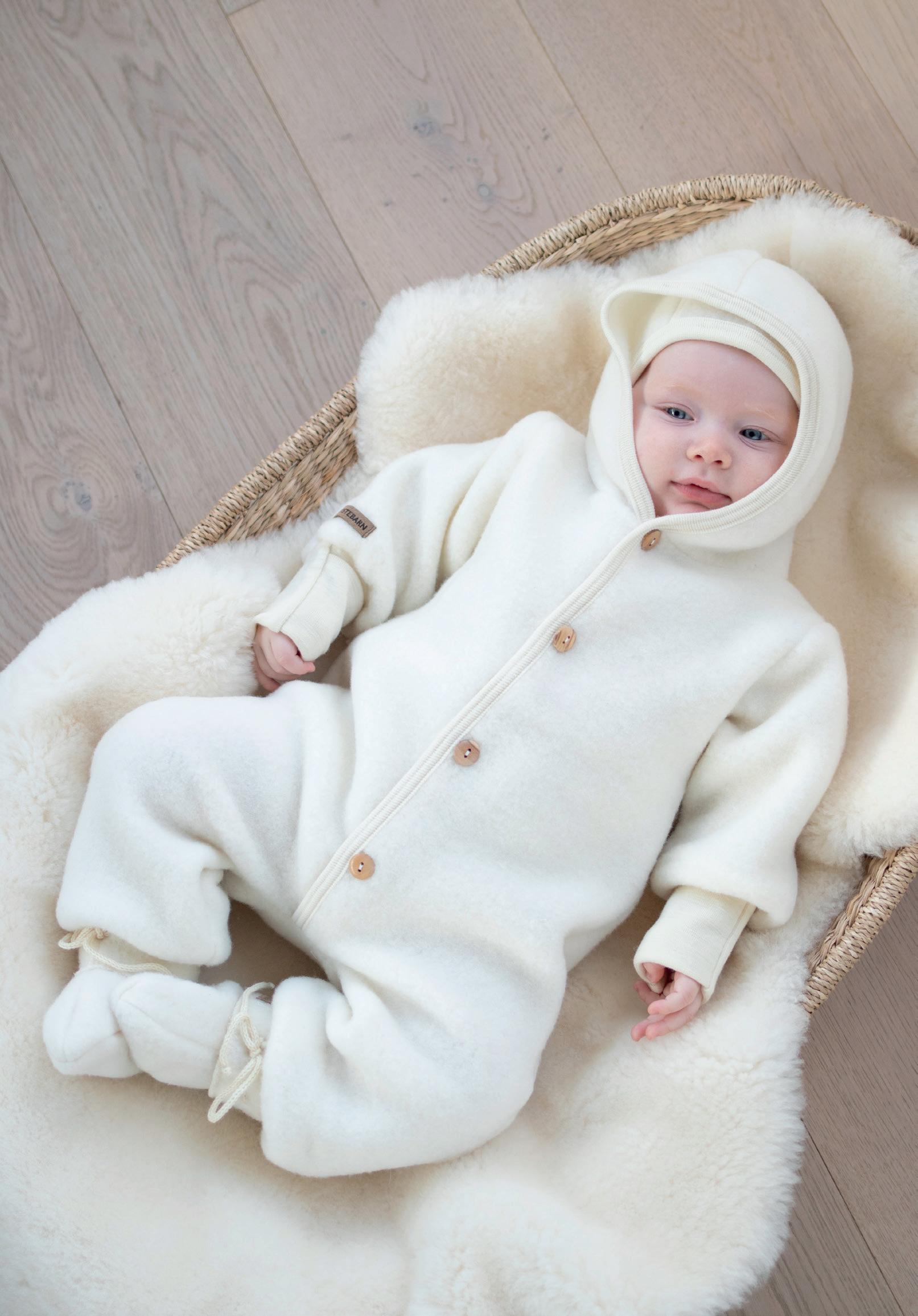 Bilde og produkt: Ull frottépysj m/fot: 0-3 år, 655-865kr. Koselam i ull: 275kr. Ullfleecedress: 0-12 mnd, 876-956kr. Soveskinn: 80+/96+ cm, 1.050/1.150kr. Ullfleecelue: 0-9 mnd, 195kr. Ullfleecesokker: 265kr.