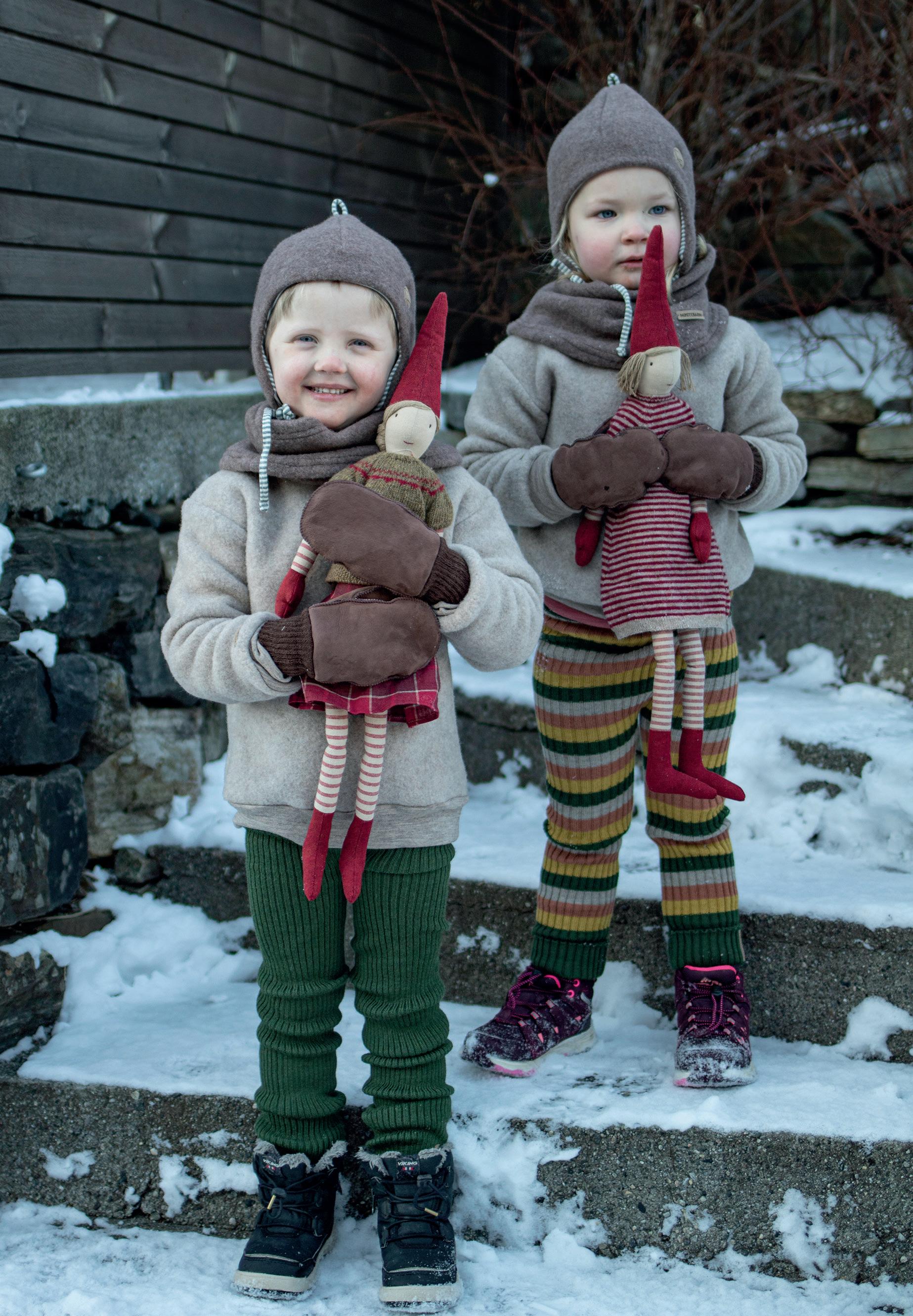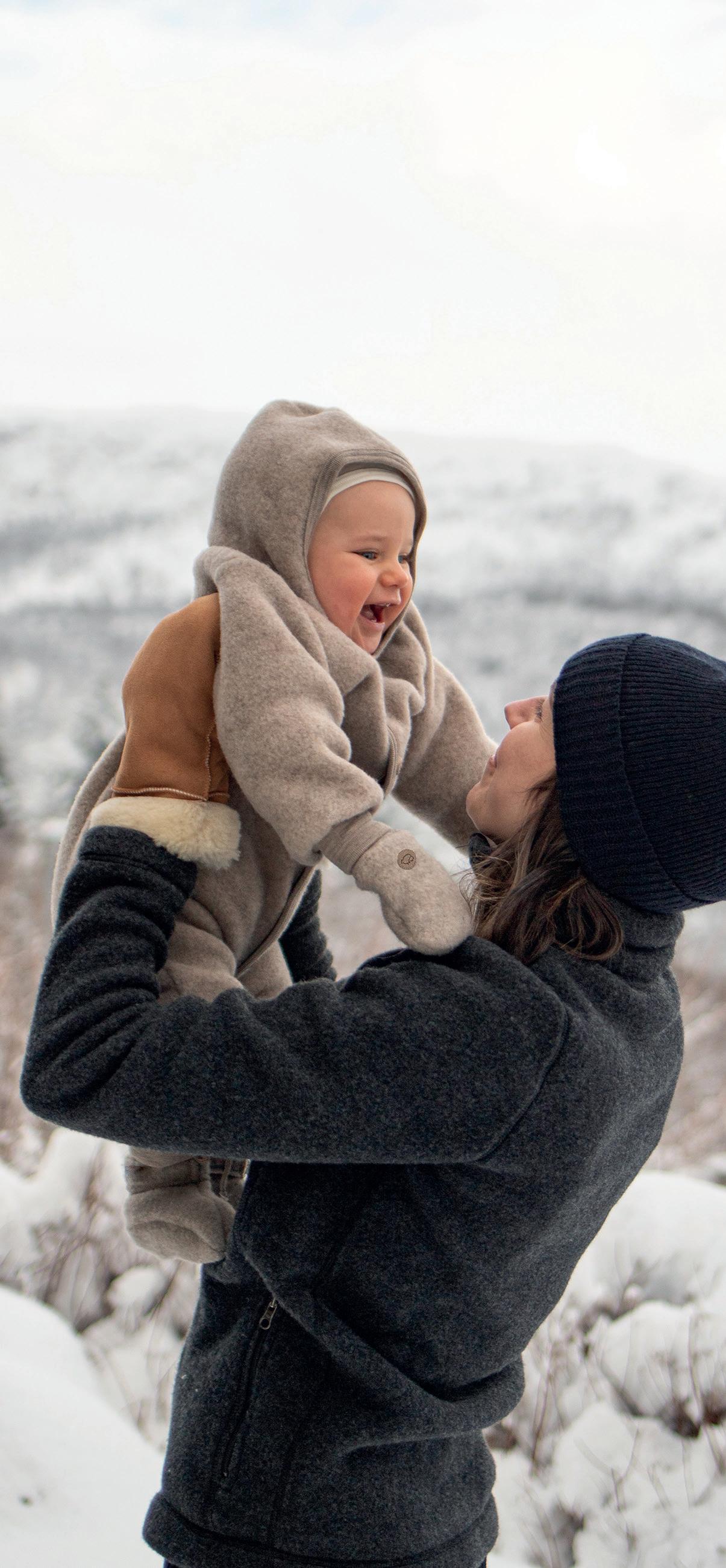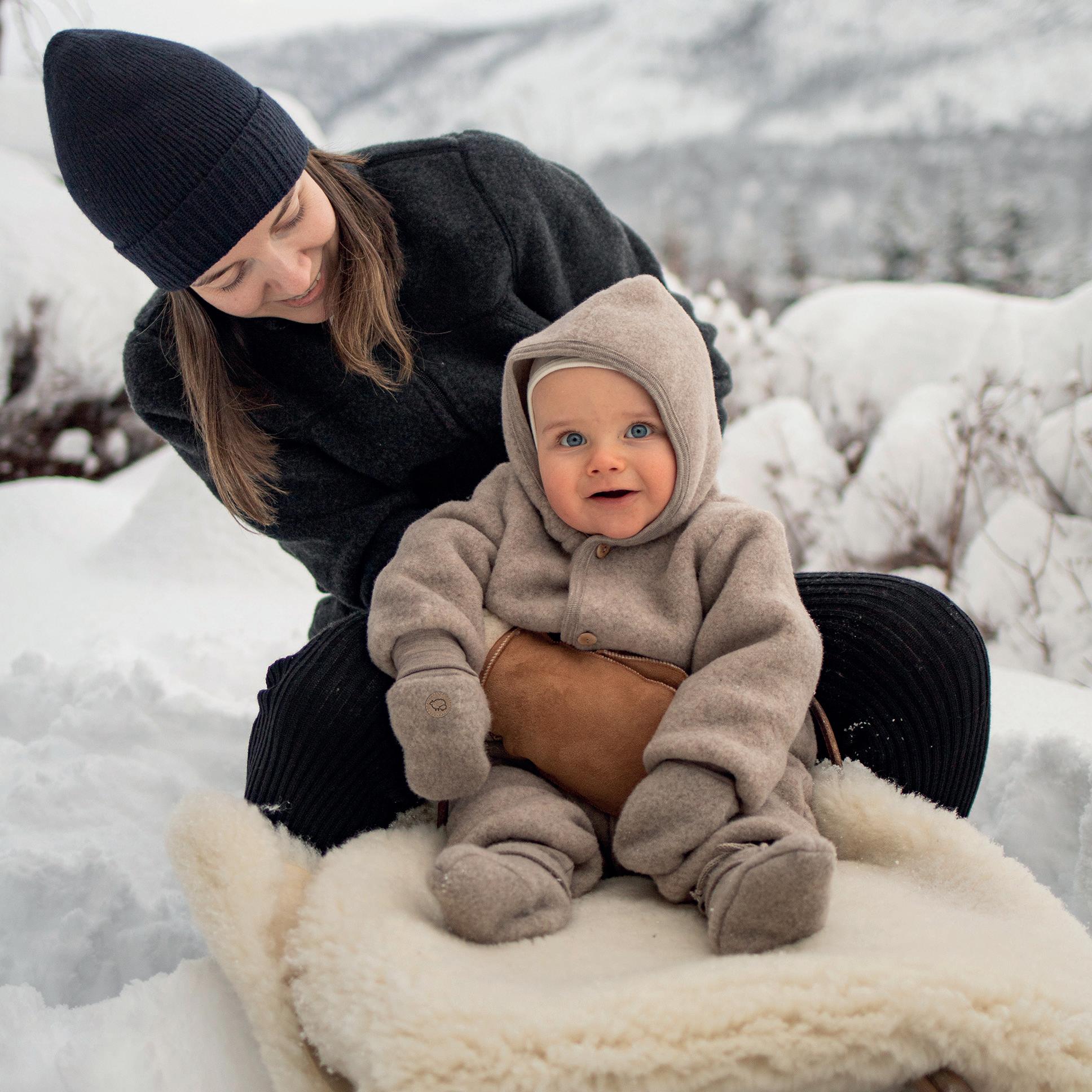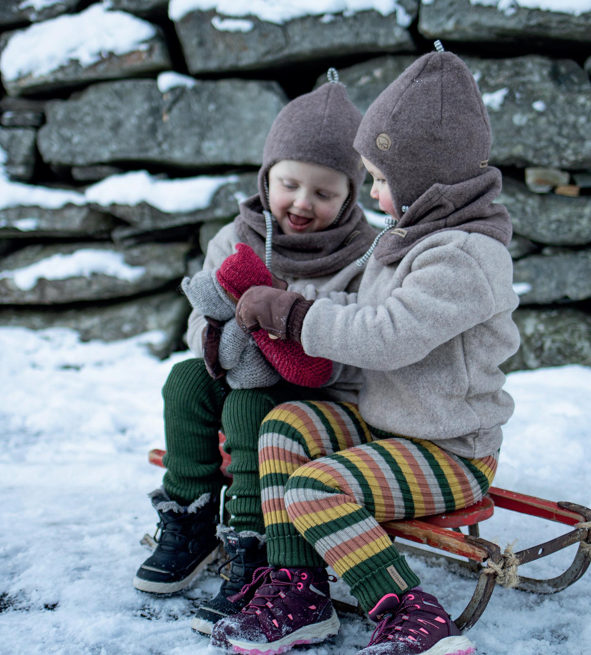 BILDE & PRODUKT: Ullfleecedress med glidelås (str. 86-104) 1.220-1.280kr. Vindlue i økologisk bomull (str. 1-6 år) 435kr. Skinnvotter (str. 1-7 år) 495kr. Barnehagevotter med ullfôr (str. 1-11 år) 458kr. Ullfleecejakke (str. 104-140) 1.300kr.
