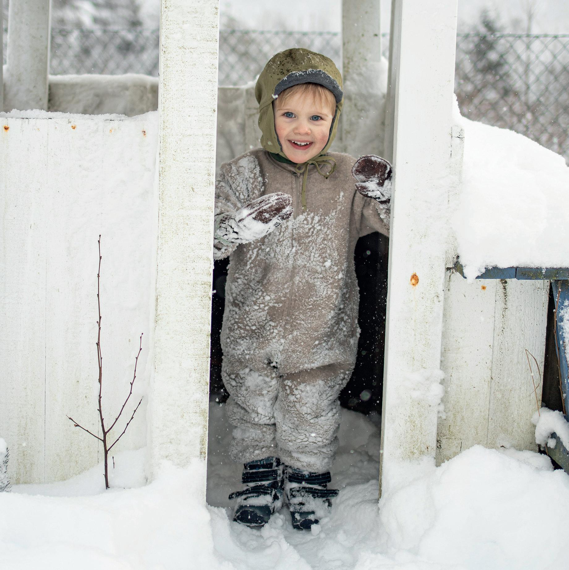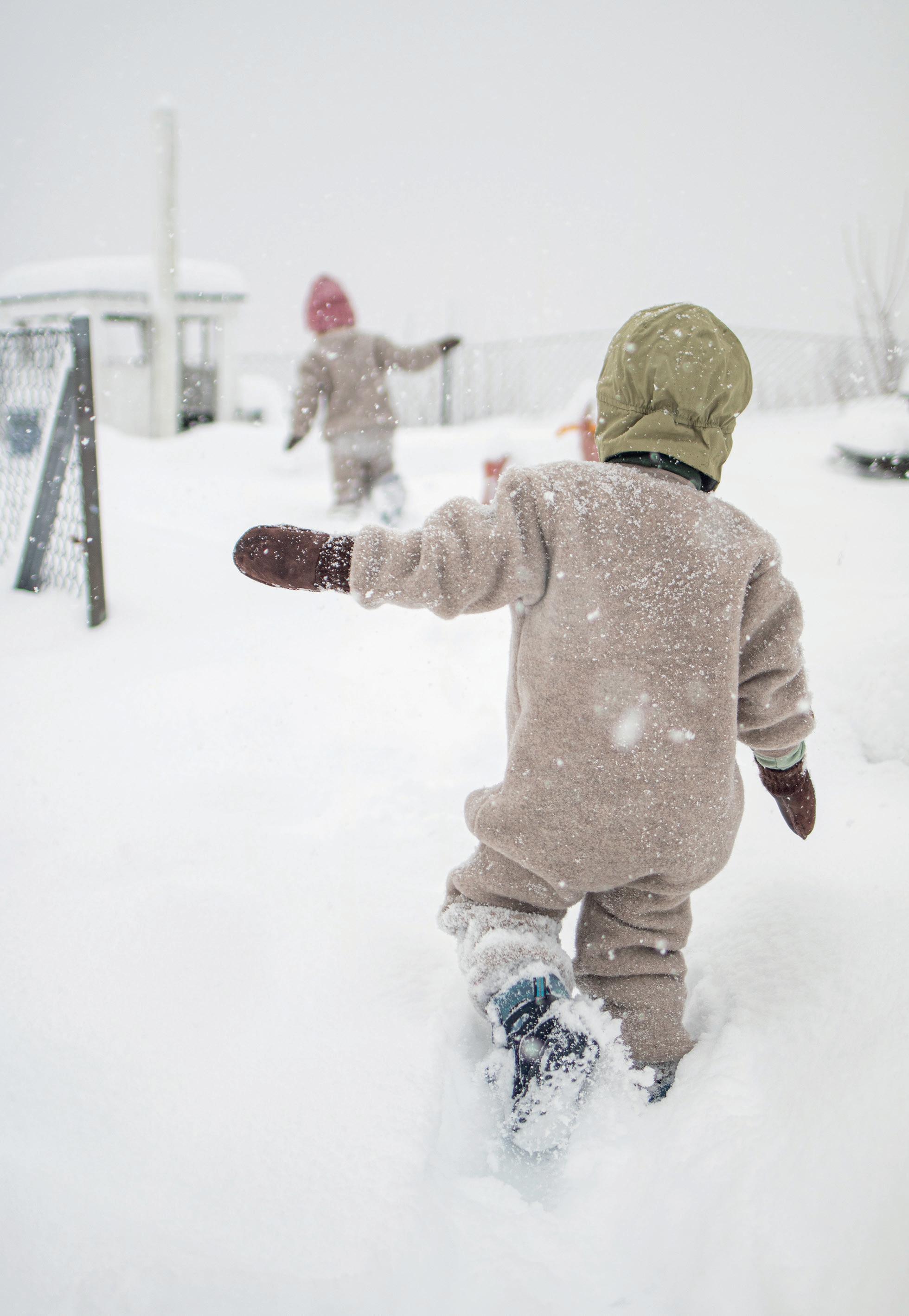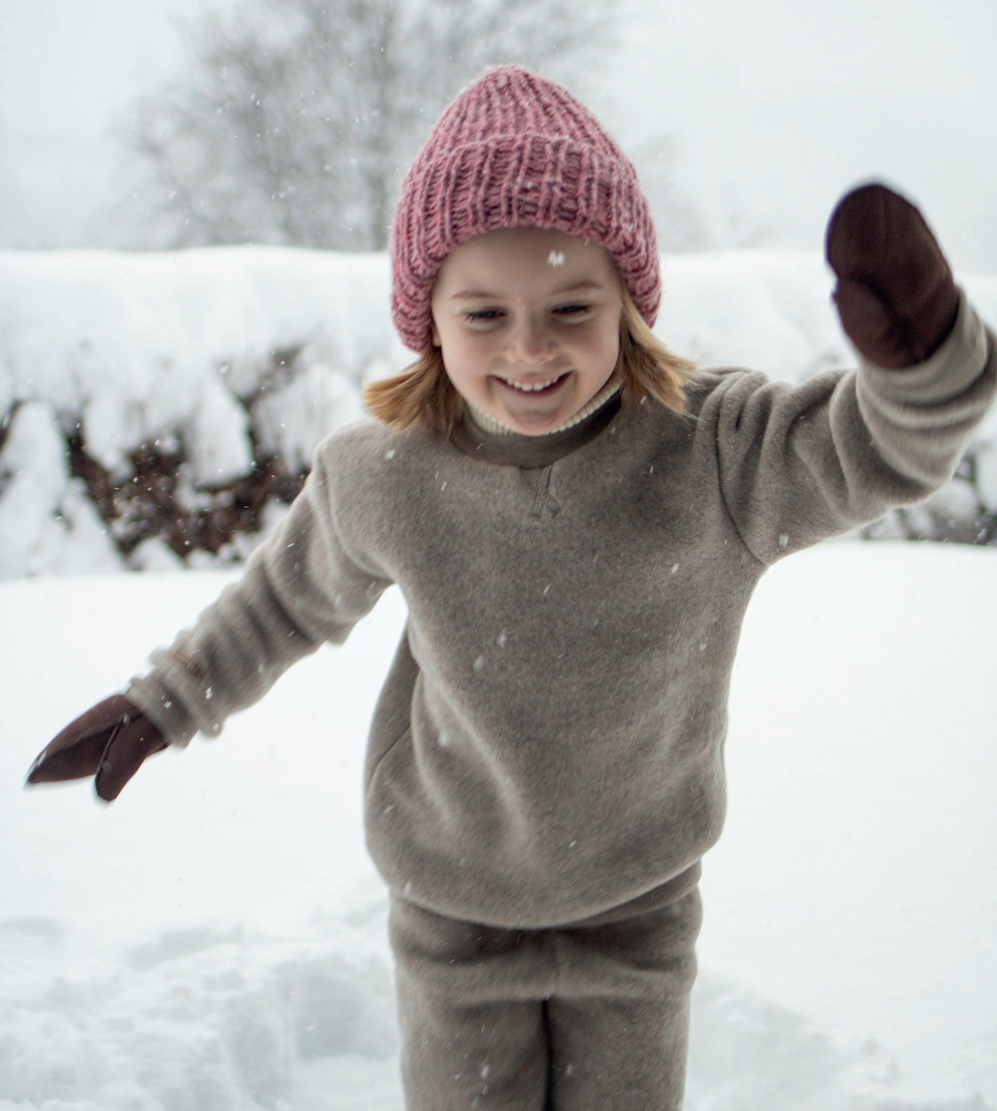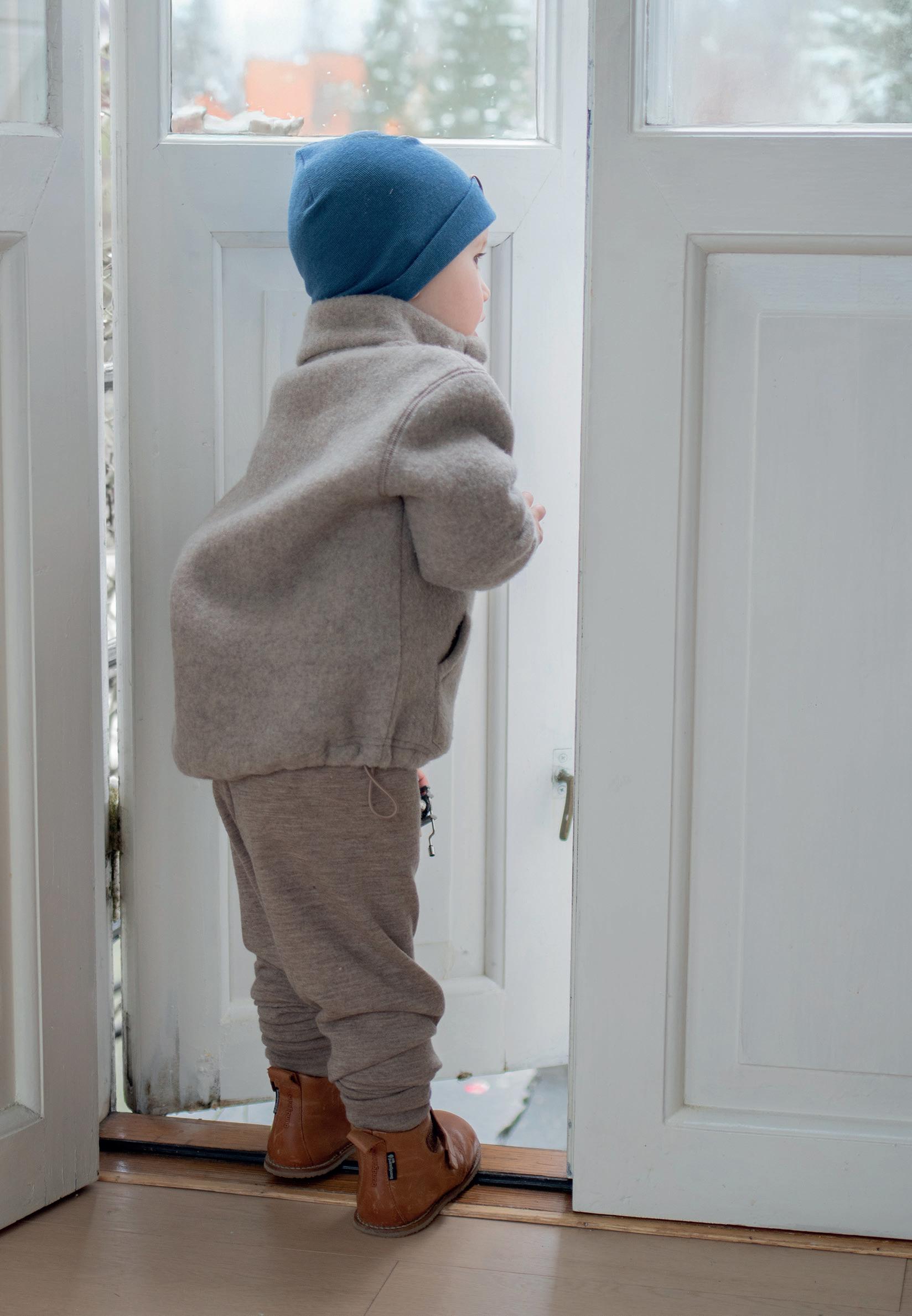 BILDE & PRODUKT: Ullfleecedress med glidelås (str. 86-104) 1.220-1.280kr. Vindlue i økologisk bomull (str. 1-6 år) 435kr. Skinnvotter (str. 1-7 år) 495kr. Barnehagevotter med ullfôr (str. 1-11 år) 458kr. Ullfleecejakke (str. 104-140) 1.300kr.