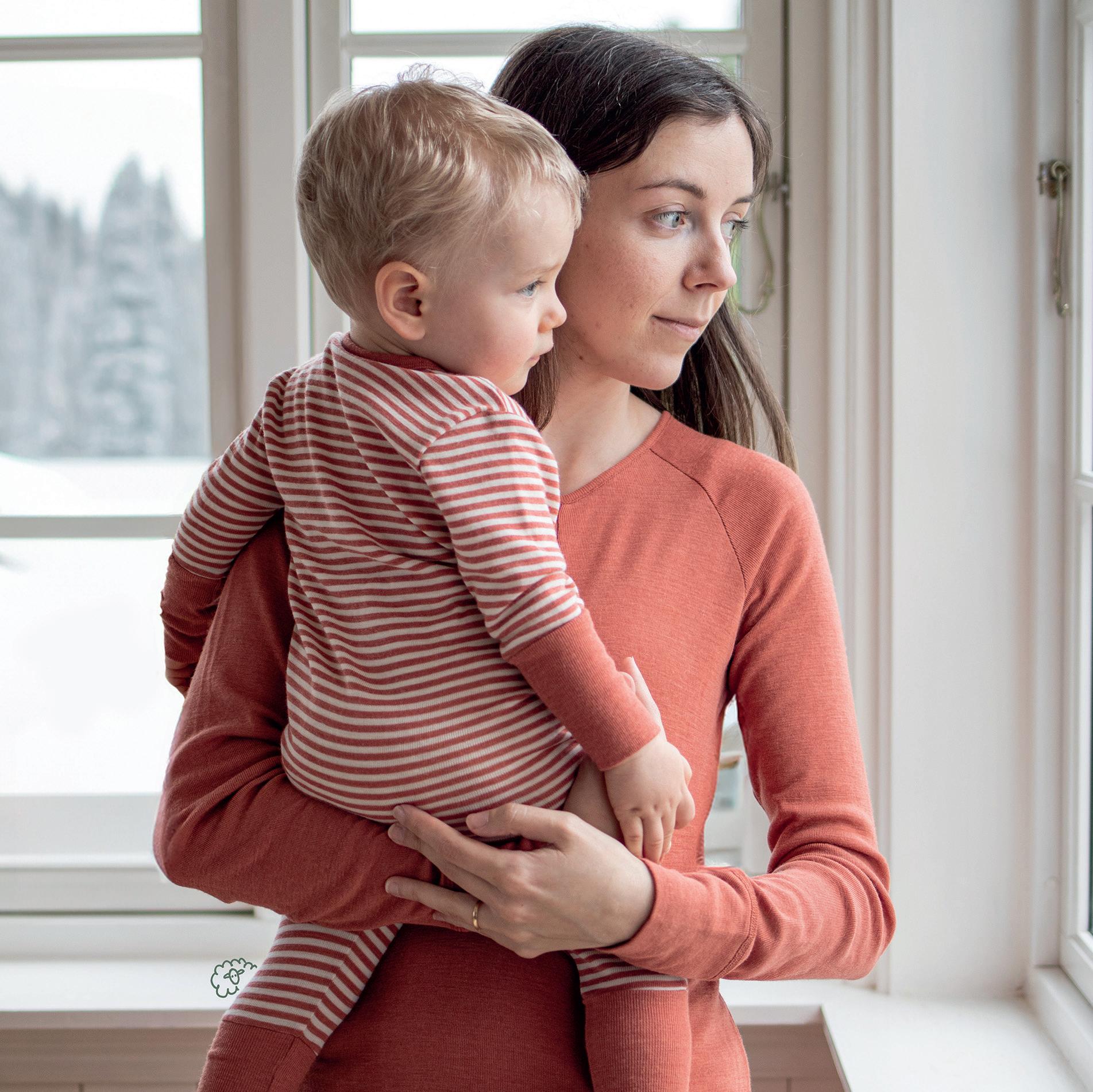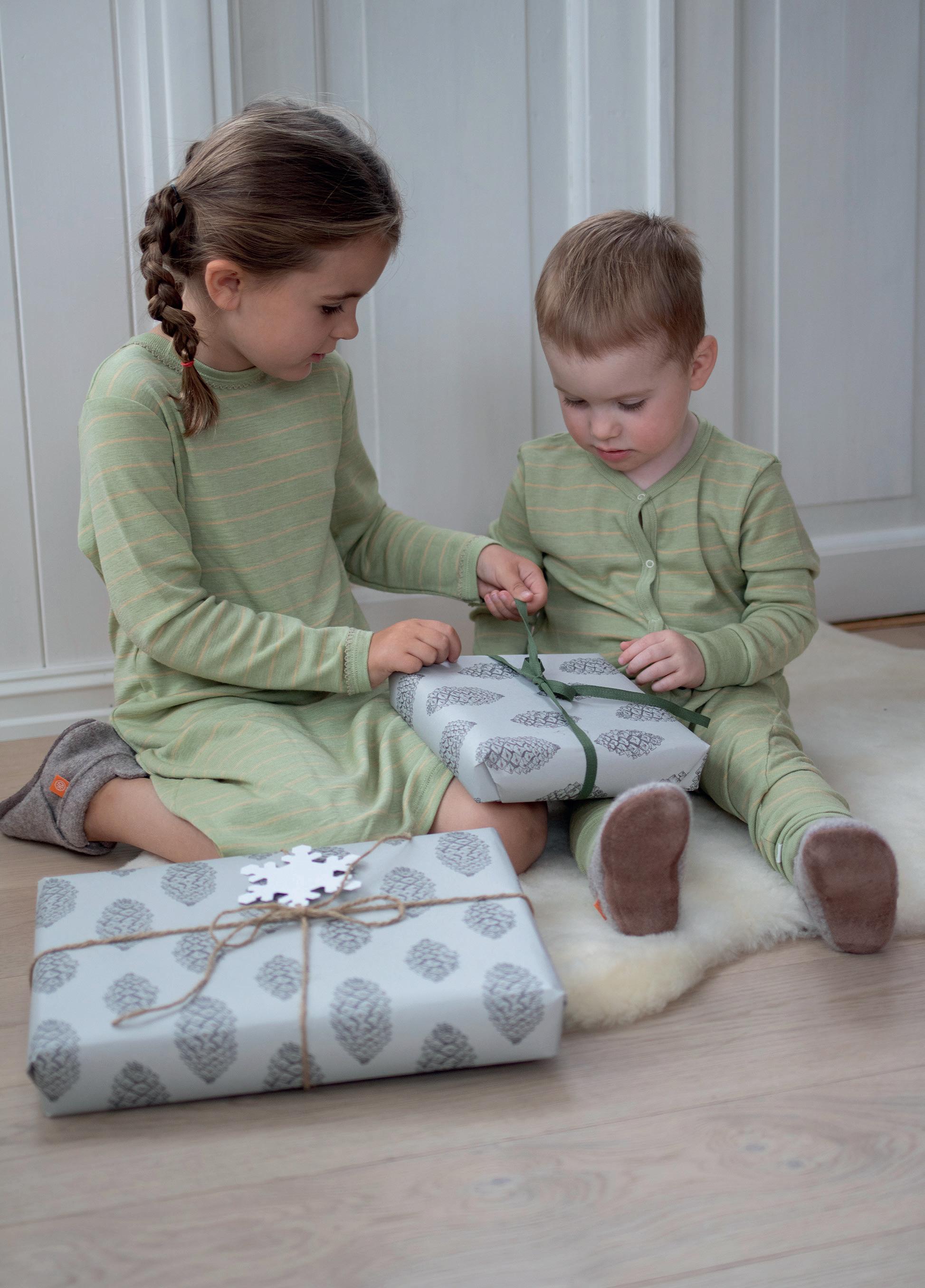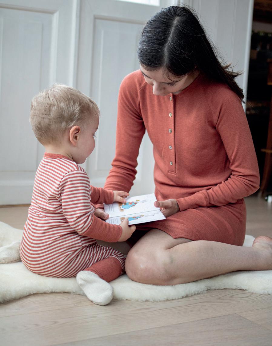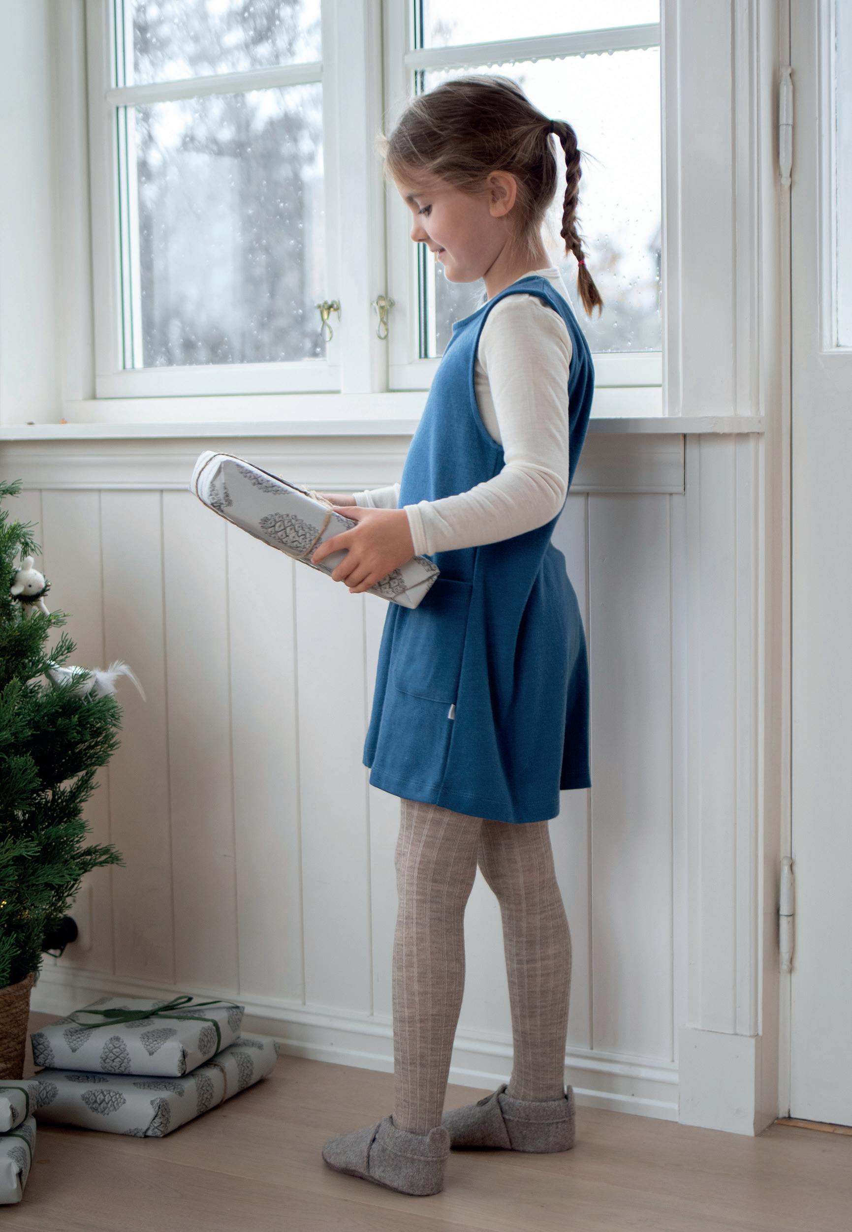 FORSIDE: Baby (0-3 år): Body i ull med silke (str. 56-98) 498kr. Ullstrømpebukse (str. 56-80) 328kr. Barn: Langermet trøye i ull med silke (str. 92-164) 498-548kr. Strømpebukse i ull med bomull (str. 86-122) 398kr. Begge: Ermløs ullkjole (str. 68-128) 588kr. Ulltøfler (str. 20-41) 599-799kr.