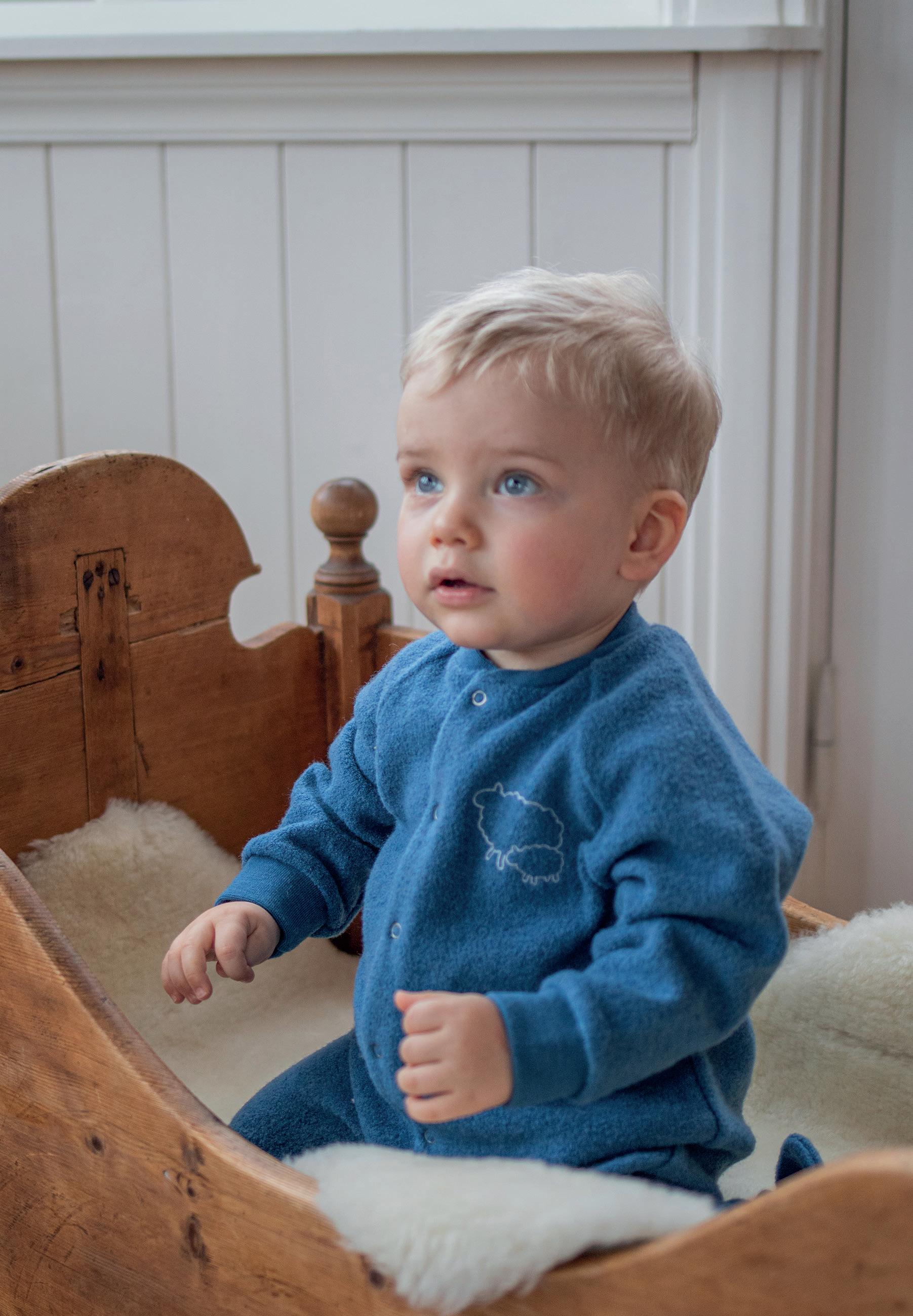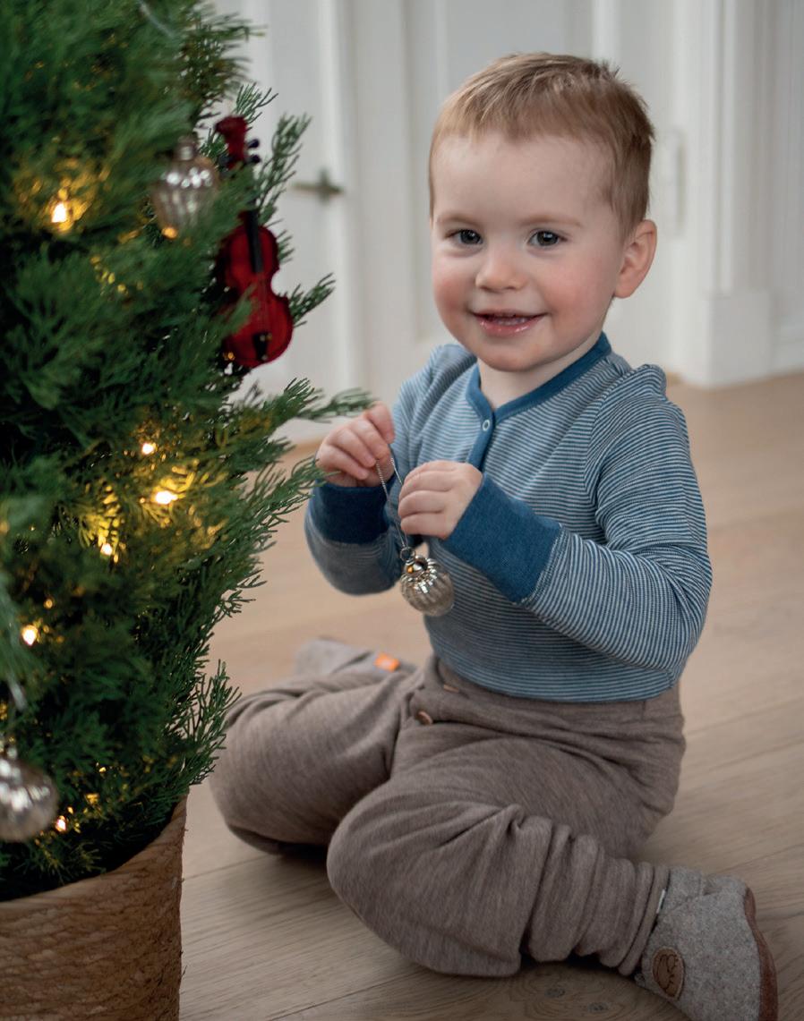 Baby (0-3 år): Babytrøye i ull med silke (str. 74-98) 488kr. Ullbukse med knapper (str. 74-98) 498kr. Body i ull med silke (str. 68-98) 498kr. Ullstrømpebukse (str. 56-80) 328kr. Barn: Langermet trøye i ull med silke (str. 92-164) 498-548kr. Strømpebukse i ull med bomull (str. 86122) 398kr. Begge: Ermløs ullkjole (str. 68-128) 588kr. Ulltøfler (str. 20-41) 599-799kr.