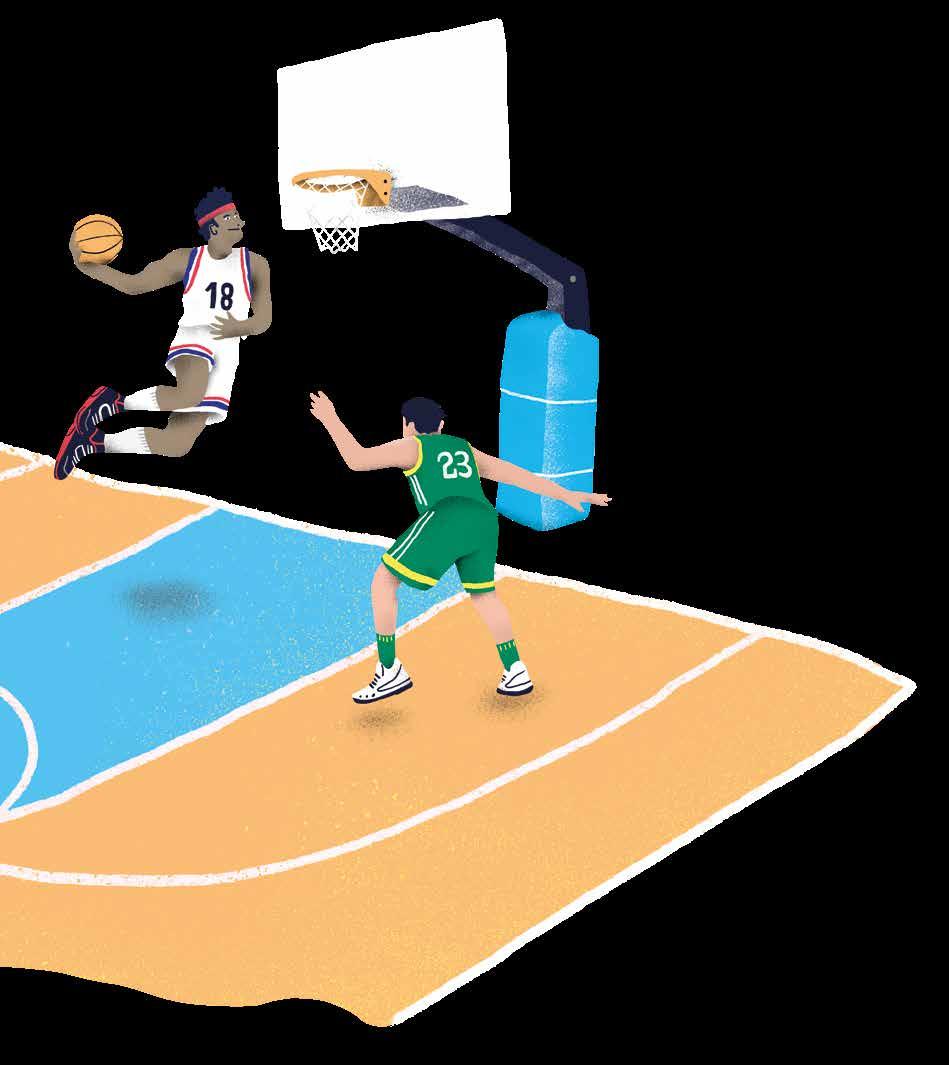 Two teams of five have to shoot the ball through their opponent’s basketball hoop. To move the ball forward, players dribble by bouncing the ball on the floor, or by passing it to one of their teammates. It’s two points for shots inside the three-point line, and three points for those outside. Pushing and shoving the other team isn’t allowed, although it’s very easy to do. The team with the most points at the end of four quarters wins.
