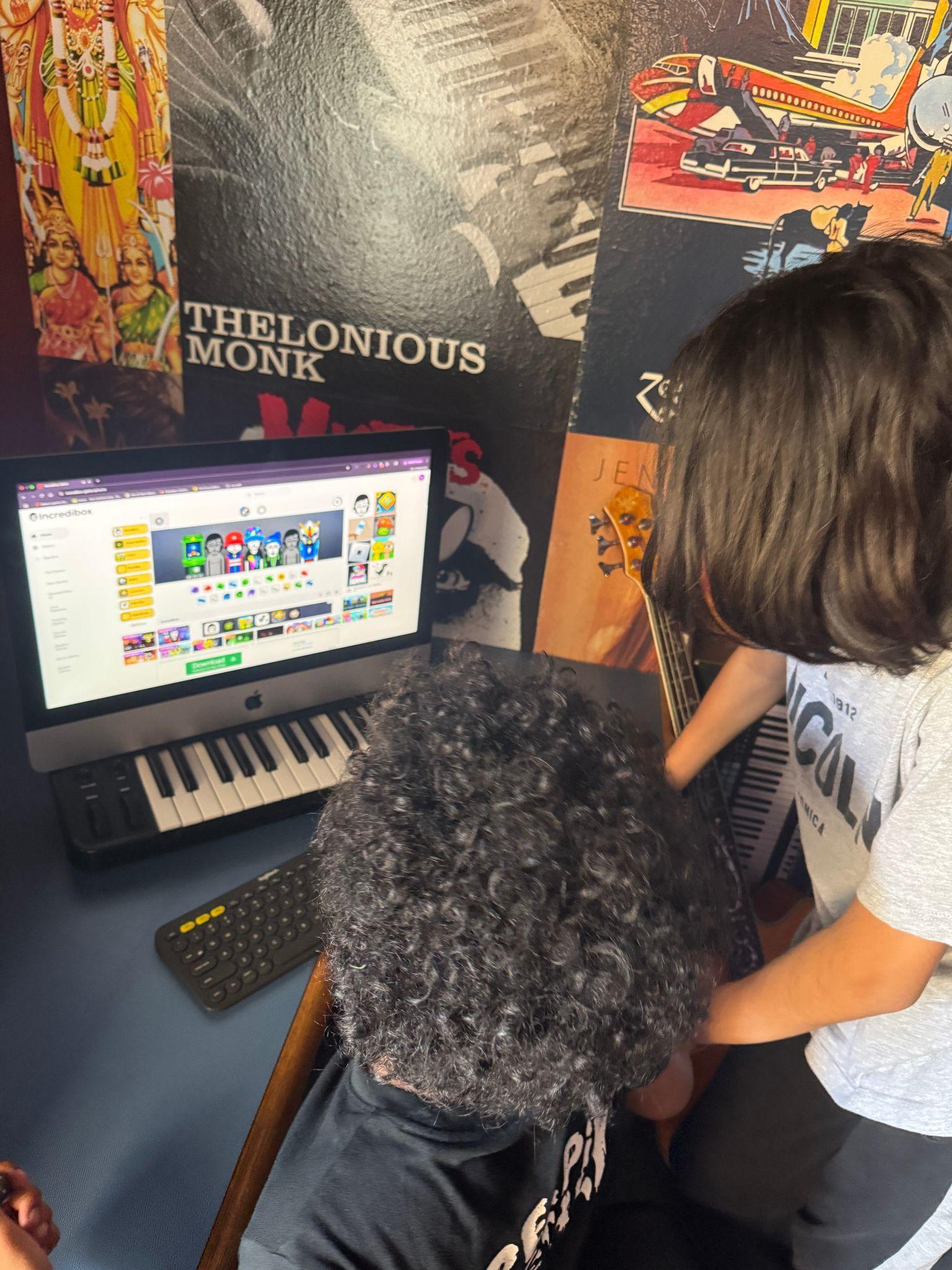 Harley and Damien work on music in their recently discovered website “incredibox”. Using beatboxing templates and loops they can create songs based on their theme of choice. Creatives will always find a way to create!