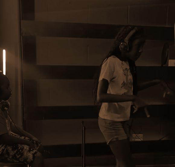 Turning 11 in just a few days, Brooklyn (Brookie Cookie) is also a veteran rapper who has been rapping since the age of 5 or 6. Each summer, she joins us for summer camp and hops back in the booth without having missed a beat. In this clip, we were in the middle of an album wrap-up session. She was adding ad-libs to a song before mixing. Sincere, another OG member, is seen behind her, supporting her.