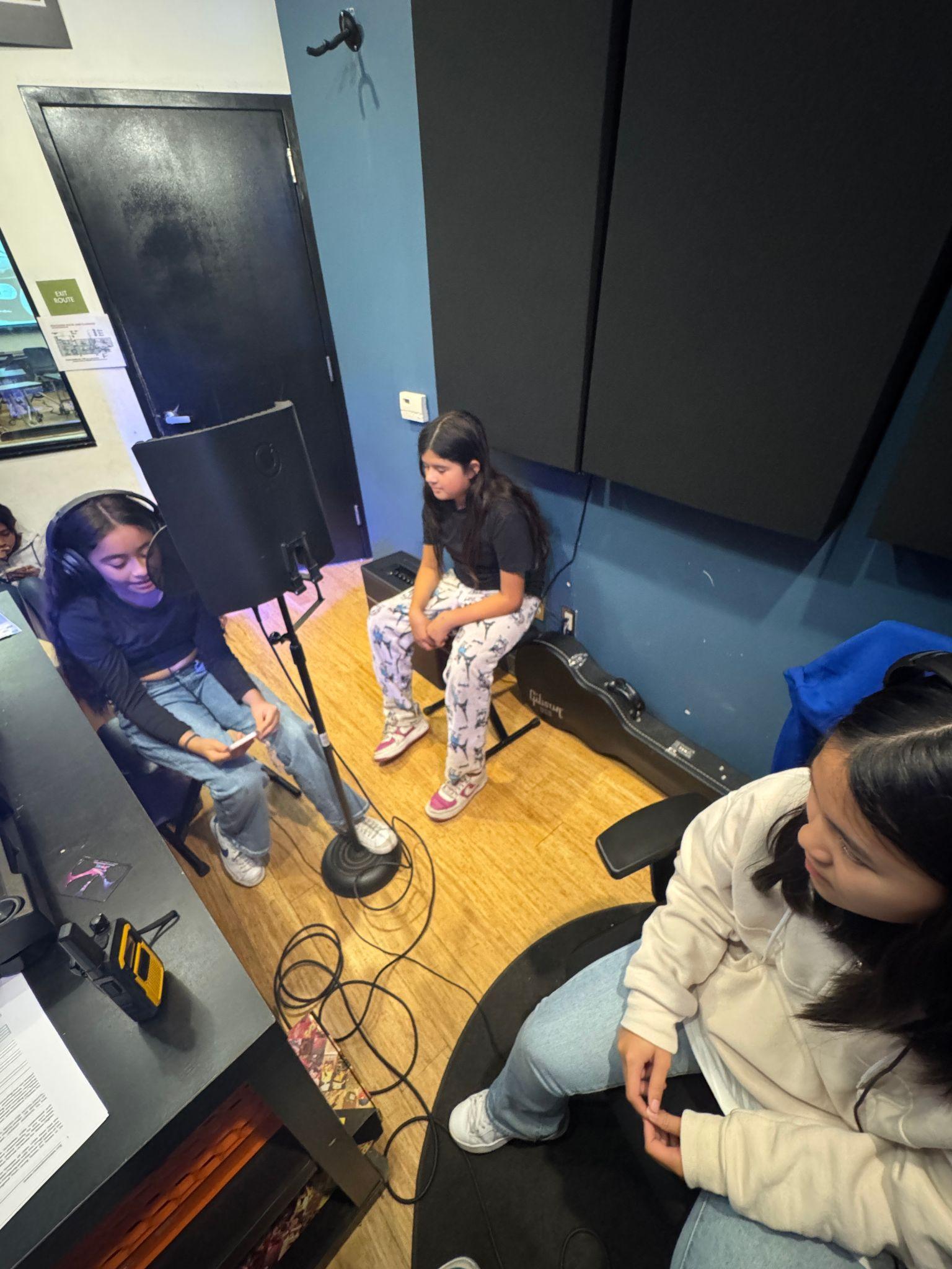 Mary, Alyssa, and Angelise get ready torecordacouplepassesofAlyssa’s cover. Learning the in and outs of both engineering and vocal production helps move the session smoothly. Wheneverything'sinsync, magichappens!