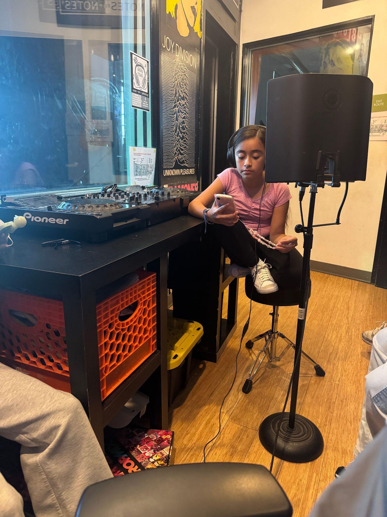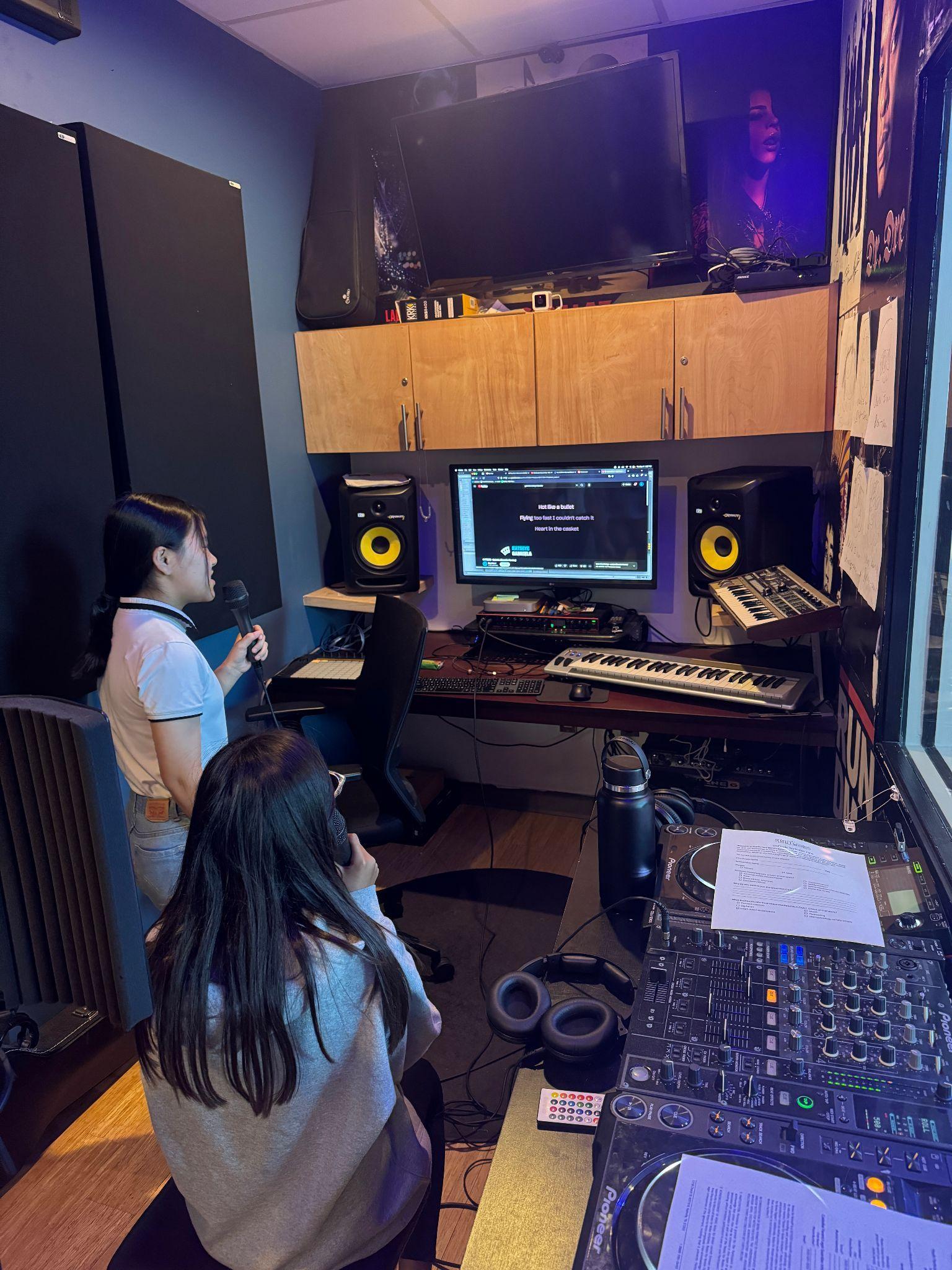 The Live room at JAMS has options for any sort of creative direction! Angelise is singingkaraokewhileconnectedtoanamp in the studio to play the songs out loud.