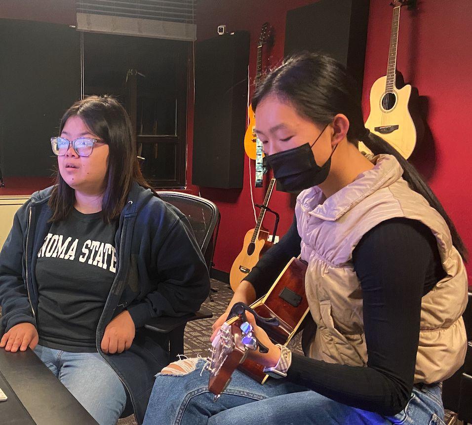 While taking breaks from studying for finals, Kelly learns “Titanium” on guitar so Krisabellecanpracticesinging.
