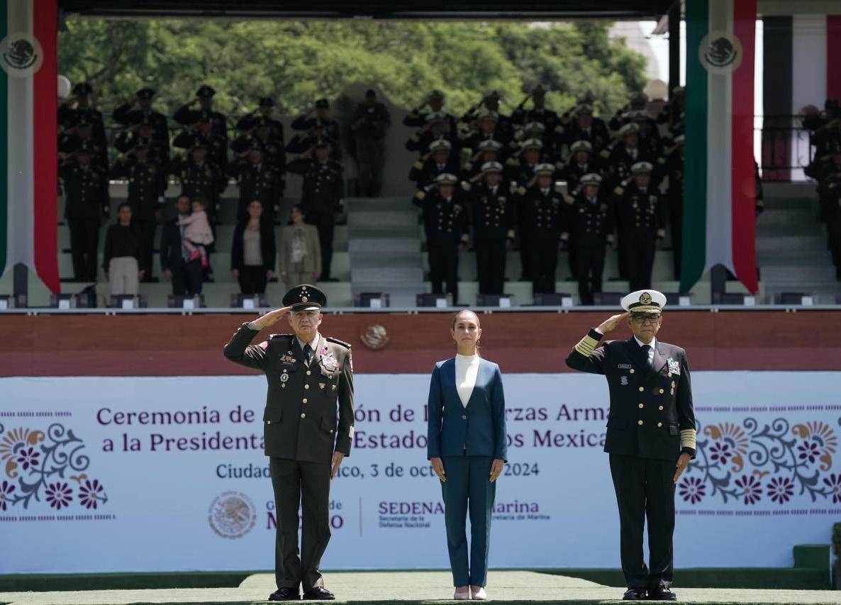 ‹›La Secretaría de Marina, Armada de México rinde honores a nuestra Comandanta, le presenta sus respetos y subordinación. Con ello, respalda y reitera su absoluto apoyo a la decisión de nuestro pueblo››, expresó. En la Ceremonia de Salutación de las Fuerzas Armadas y Guardia Nacional a la Presidenta Constitucional de los Estados Unidos Mexicanos estuvieron presentes el jefe de Gobierno de la Ciudad de México, Martí Batres; la secretaria de Gobernación, Rosa Icela Rodríguez; y el secretario de Seguridad y Protección Ciudadana, Omar García Harfuch. Además, el subsecretario de la Defensa Nacional, general Enrique Covarrubias López; el subsecretario de Marina, almirante José Barradas Cobos; el oficial mayor de la Sedena, general Enrique Martínez López; el oficial mayor de la Marina, almirante Francisco Guillermos Escamilla Cázares; el inspector y contralor general del Ejército y Fuerza Aérea, general Jaime González Ávalos; el inspector y contralor general de Marina, almirante Gerardo de Jesús Toledo Guzmán; el jefe de Estado Mayor Conjunto de la Defensa Nacional, general Arturo Coronel Flores; el jefe de Estado Mayor General de la Armada, almirante José Manuel Salinas Pérez; el comandante del Ejército mexicano, general Norberto Cortés Rodríguez; el comandante del Cuartel General del Alto Mando de la Armada, vicealmirante Alfredo Ramón Enríquez Delgado; el comandante de la Fuerza Aérea Mexicana, general Óscar René Rubio Sánchez y el comandante interino de la Guardia Nacional, general Hernán Cortés Hernández.