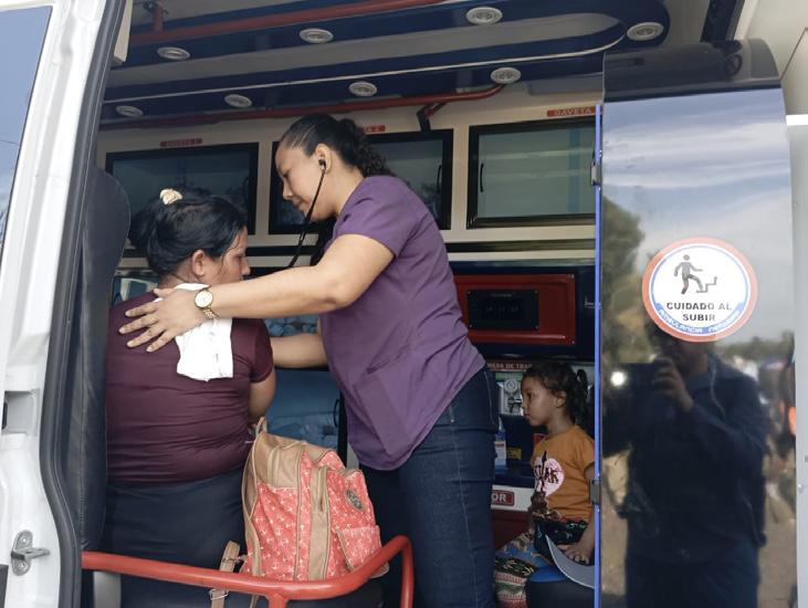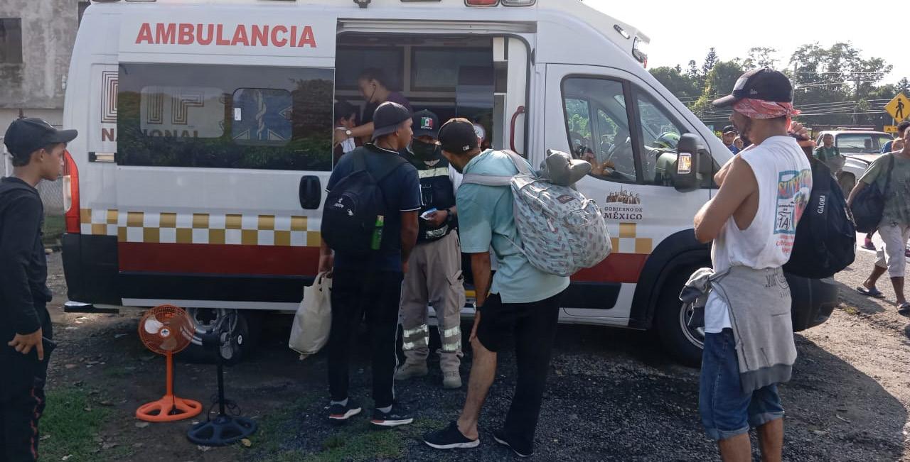 Protección Civil Municipal de Tapachula, atiende personas migrantes que han sufrido golpes de calor y lesiones en sus pies.