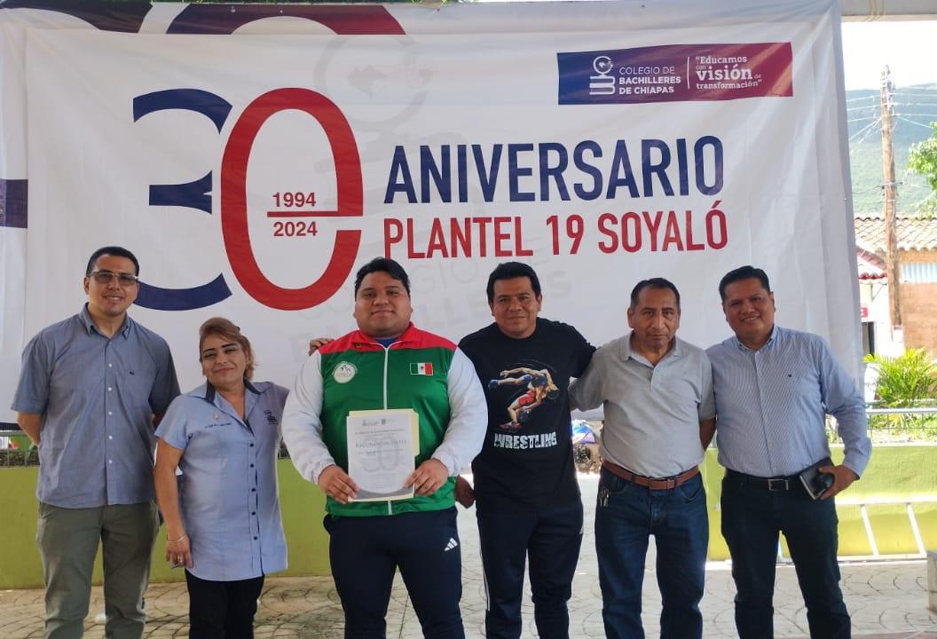 Atletas de la escuela de Luchas Asociadas del Indeporte, realizaron exhibición dentro de los festejos de los 30° Aniversario del plantel 19 del Cobach en Soyaló, como parte del convenio de colaboración que existe entre el Instituto del Deporte y el Colegio de Bachilleres de Chiapas (Cobach), con la finalidad de contribuir