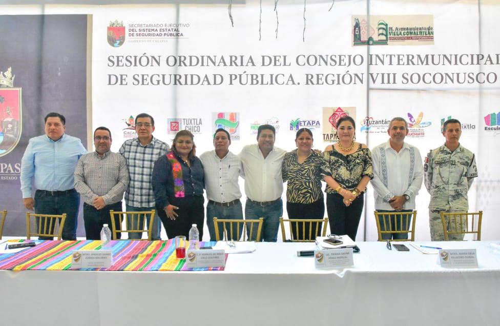 Suchiate, Chiapas, 06 de septiembre.- Por el bienestar y la tranquilidad de la ciudadanía, el Ayuntamiento de Tapachula representado por la presidenta municipal, Gladiola Soto Soto, participó en los trabajos de la XII Sesión Ordinaria del Consejo Intermunicipal de Seguridad Pública Región VIII Soconusco, que se realizó con la participación de autoridades de los tres órdenes de gobierno. Ante el presidente del Consejo Intermunicipal de Seguridad Pública Región VIII Soconusco, Manuel de Jesús Cruz Coutiño, la alcaldesa de Tapachula, destacó los logros alcanzados con el compromiso y la voluntad de todos los involucrados para dar cumplimiento a los acuerdos en coordinación con el Secretario Ejecutivo del Estado y los Ayuntamientos. Mencionó que parte fundamental fue el respaldo del Centro de Evaluación y Confianza y del Instituto de Formación Policial por lo que se obtuvo un avance significativo en todos
