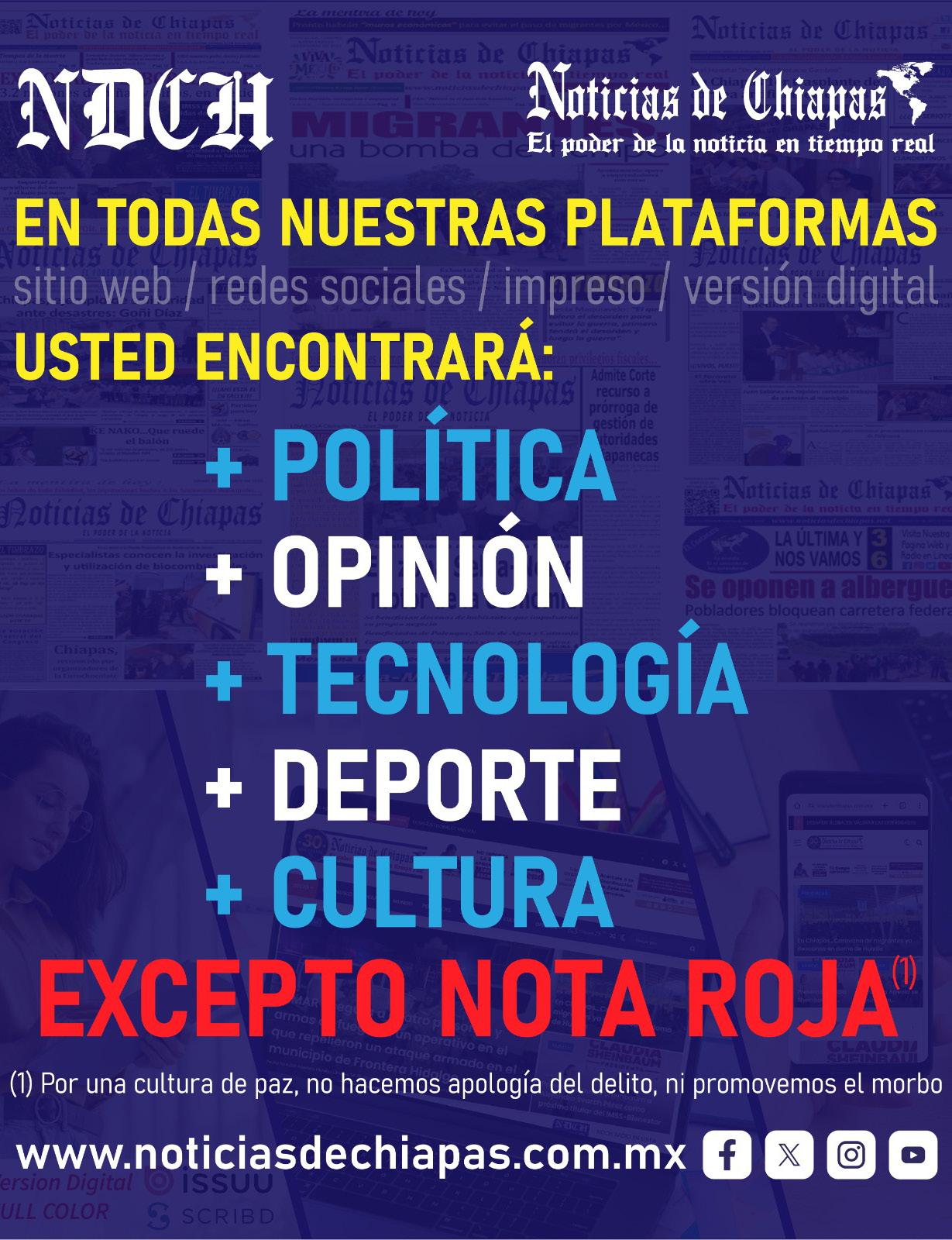 Noticias de Chiapas El poder de la noticia, se imprime en los talleres de Editorial La Estrella, S.A. de C.V., con domicilio en 2a. Av.Sur Número 100 C.P. 30700, Tapachula, Chiapas.