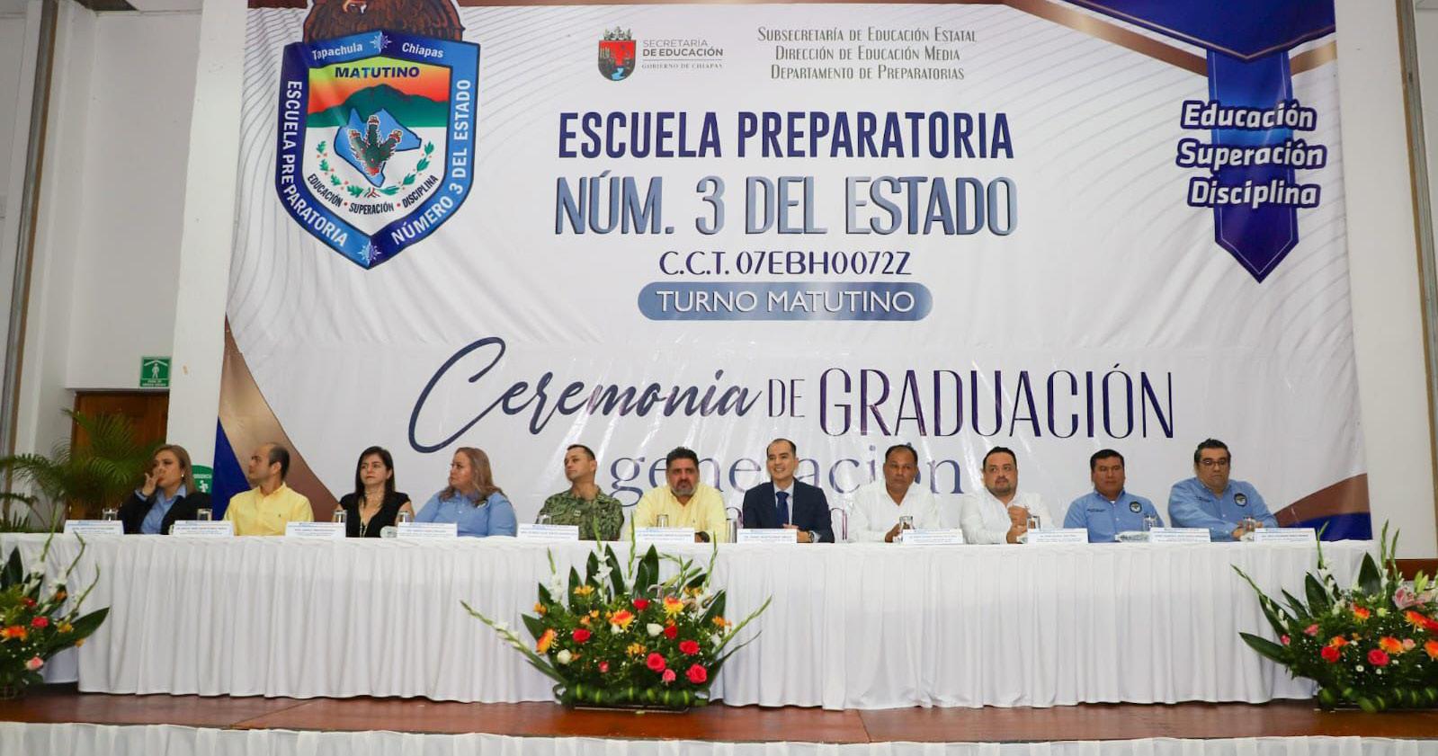 Tapachula, Chiapas, 16 de julio.Con la representación de la alcaldesa de Tapachula, Gladiola Soto Soto, el síndico municipal, Santiago Ancheita Calderón asistió como invitado especial a la Ceremonia de Clausura y Graduación 2021-2024 de la Escuela Preparatoria No. 3 de esta ciudad.