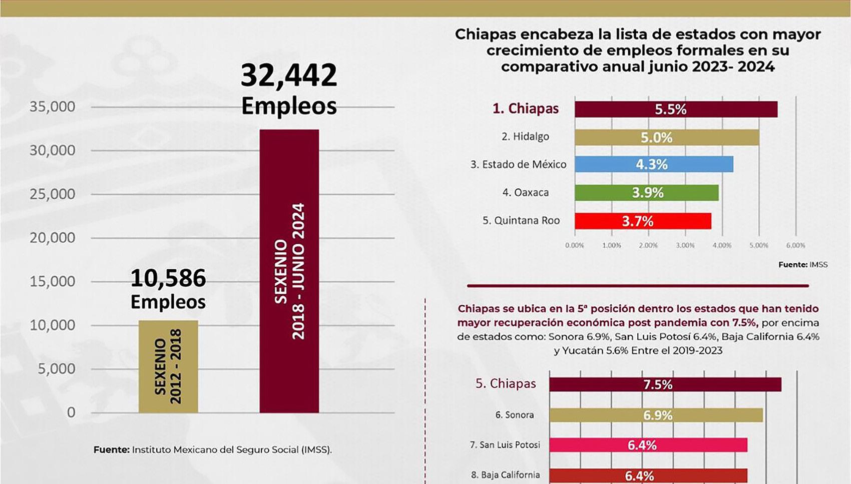 Aunado esto, el Instituto Nacional de Estadística y Geografía (Inegi) dio a conocer que entre 2019 y 2023, Chiapas logró ubicarse en la quinta posición dentro los estados que han tenido mayor recuperación económica post pandemia con 7.5 por ciento, por encima de estados como: Sonora con 6.9, San Luis Potosí con 6.4, Baja California con 6.4 y Yucatán con 5.6.