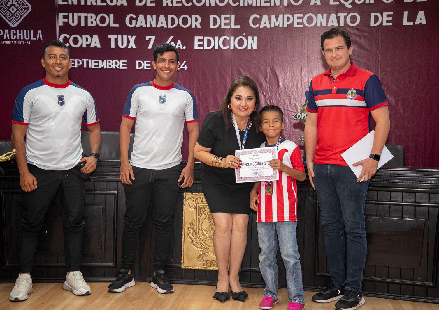Tapachula, Chiapas, 19 de septiembre.- La presidenta municipal de Tapachula, Gladiola Soto Soto entregó a nombre del Ayuntamiento reconocimientos a los integrantes del equipo Rebaño Chivas de Tapachula -filial del Club Deportivo Guadalajara-, quienes se coronaron campeones de la copa Tux. 4ª. Edición.