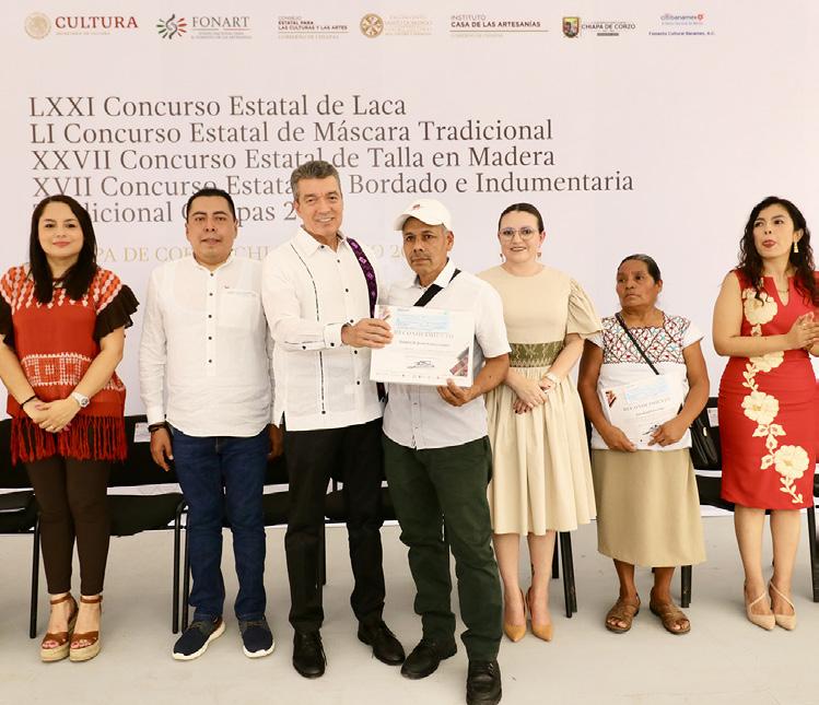 25 de julio.- El gobernador Rutilio Escandón Cadenas encabezó la premiación de los concursos estatales de Laca en su edición 71, de Máscara Tradicional edición 51, el 27 de Talla en Madera y el 17 de Bordado e Indumentaria Tradicional, certámenes que, destacó, dan muestra de la riqueza cultural y el talento que hay en el trabajo artesanal chiapaneco.