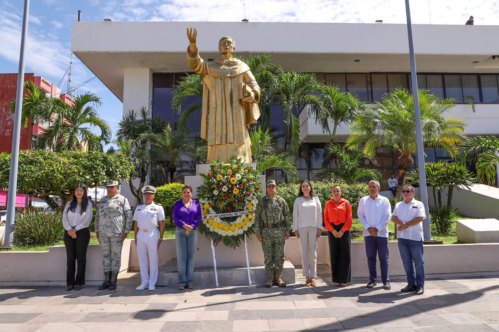 Acompañada por integrantes del Cabildo y representantes civiles y de las fuerzas armadas, Gladiola Soto Soto depositó una ofrenda floral y montó guardia de honor en la estatua del prócer chiapaneco, Fray Matías de Córdova.