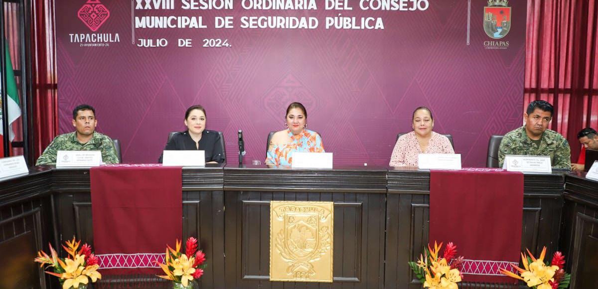 Tapachula, Chiapas, 29 de julio.- La presidenta municipal de Tapachula, Gladiola Soto Soto encabezó la XXVIII Sesión Ordinaria del Consejo Municipal de Seguridad Pública, en la que se refrendó el compromiso del Ayuntamiento para garantizar la seguridad de los tapachultecos.