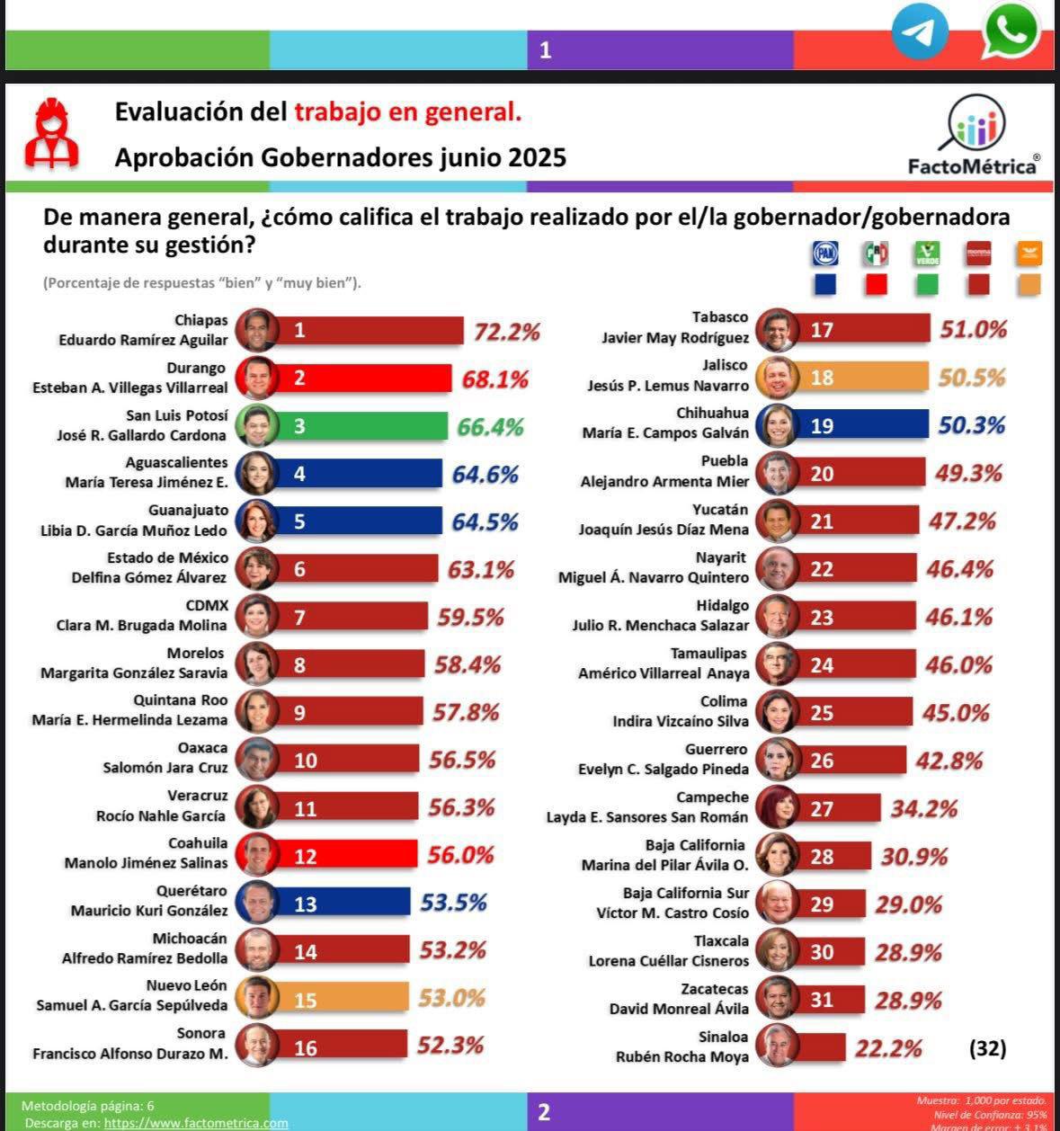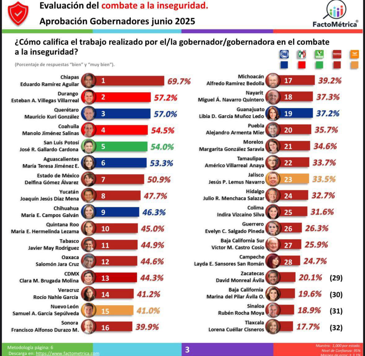 Tuxtla Gutiérrez, Chiapas; 15 de julio de 2025.- Según la más reciente encuesta de FactoMétrica (junio 2025), el gobernador de Chiapas, Eduardo Ramírez Aguilar, encabeza la aprobación ciudadana en materia de seguridad a nivel nacional, con un 69.7% de opiniones positivas.