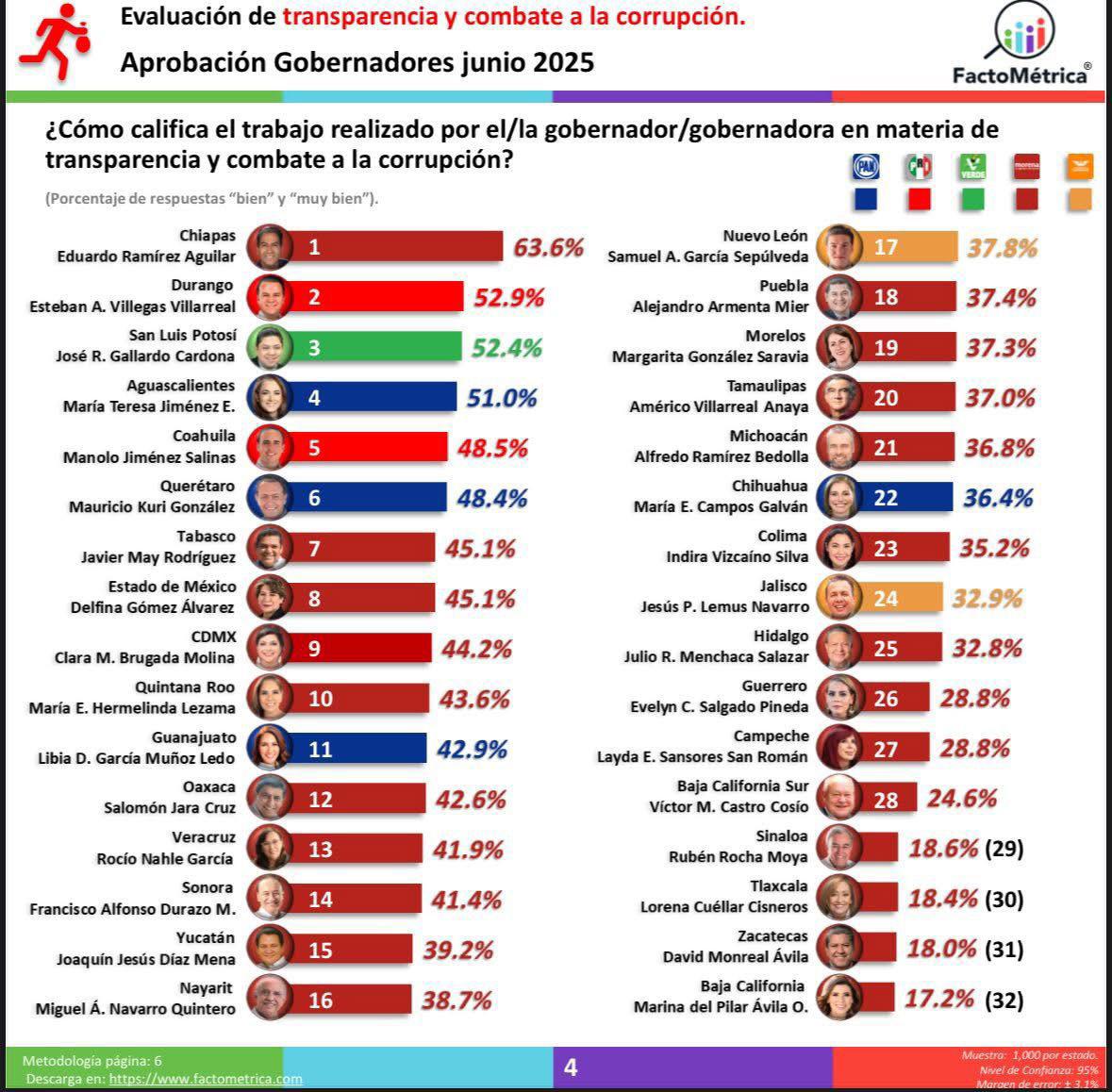 La evaluación considera la percepción de la ciudadanía sobre el trabajo de los gobernadores y gobernadoras en el combate a la inseguridad, transparencia y combate a la corrupción y el trabajo en general; todas lideradas por Eduardo Ramírez Aguilar.