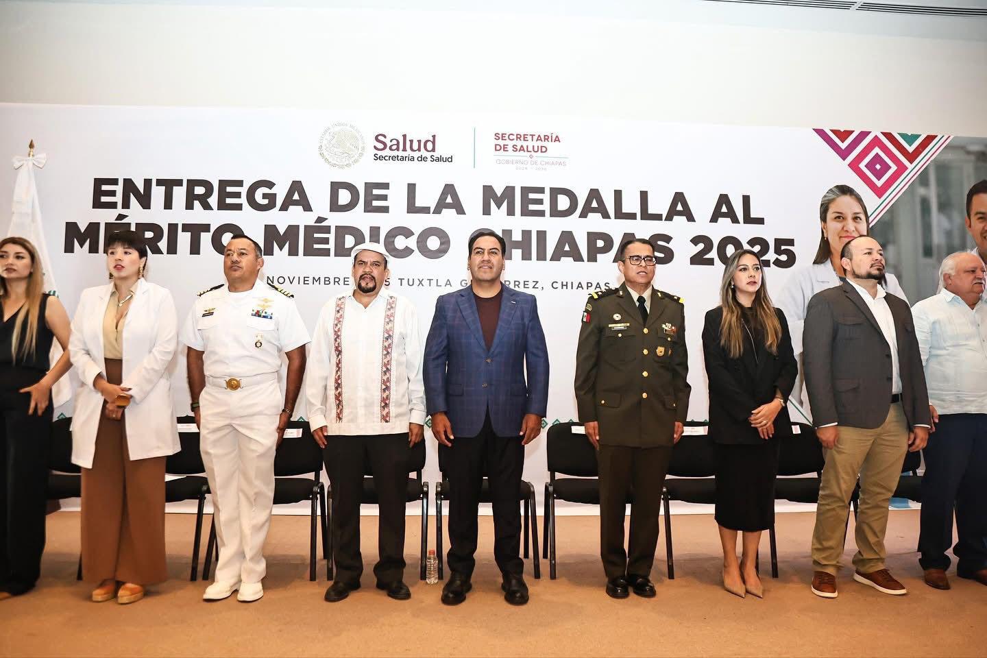 Tuxtla Gutiérrez, Chiapas; 14 de noviembre de 2025.- El gobernador Eduardo Ramírez Aguilar encabezó la entrega de la Medalla al Mérito Médico Chiapas 2025 al doctor Salvador Pacheco Segura, a quien describió como un hombre íntegro y patriota que, mediante su labor, llevó esperanza y mejor calidad de vida a la población más necesitada en distintas regiones del estado.