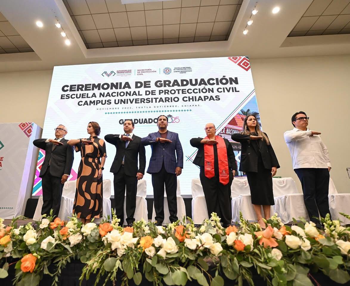 Tuxtla Gutiérrez, Chiapas; 14 de noviembre de 2025.- El gobernador Eduardo Ramírez Aguilar asistió a la ceremonia de graduación de estudiantes de licenciatura, maestría y doctorado de la Escuela Nacional de Protección Civil (Enaproc), Campus Universitario Chiapas. En este marco, felicitó a las y los profesionistas y los llamó a desempeñarse con humanismo, lealtad y dedicación, poniendo sus conocimientos al servicio de sus estados y países.