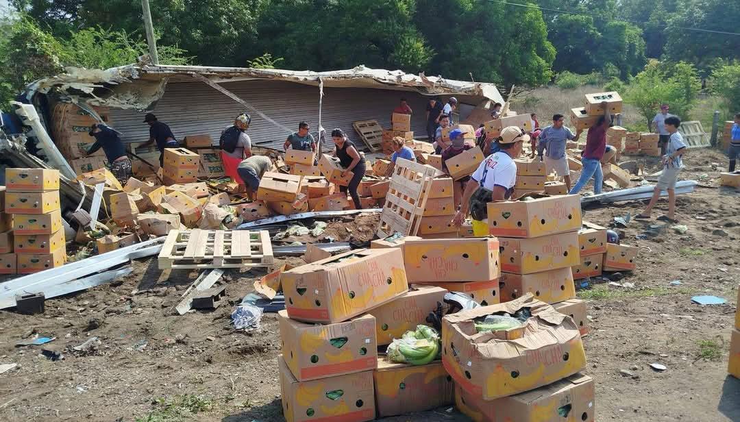Minutos después del percance, decenas de personas llegaron al lugar para sustraer las cajas de plátano esparcidas tras la volcadura, en un acto de rapiña.