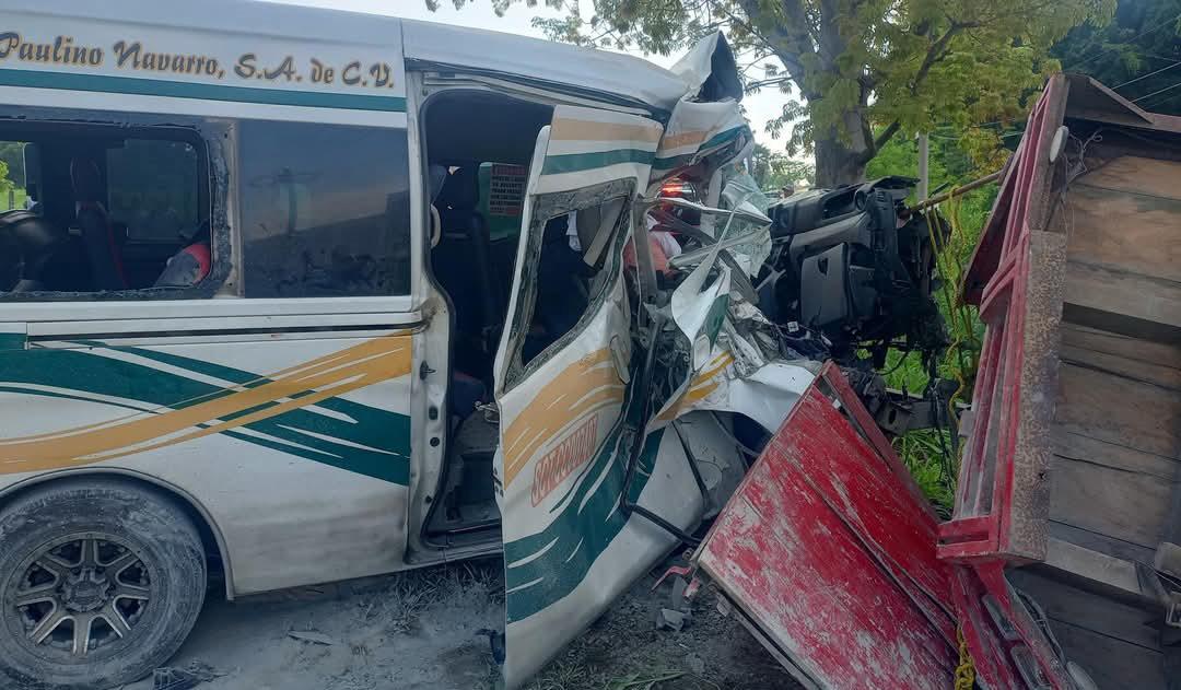 Una persona perdió la vida y al menos diez más resultaron lesionadas tras un aparatoso choque entre una combi de transporte público y un camión de carga,