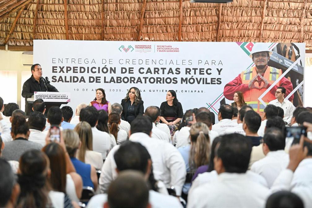 Tuxtla Gutiérrez, Chiapas; 10 de abril de 2025.- En el marco de la entrega de credenciales para la expedición de cartas a Representantes Técnicos de Empresas Constructoras (RTEC) y del banderazo de salida a las unidades de laboratorio móviles, el gobernador Eduardo Ramírez Aguilar reafirmó que su administración mantiene una política de cero tolerancia a la corrupción y un compromiso firme con la reactivación de la economía local, al priorizar la contratación de empresas de cada región para ejecutar la obra pública.