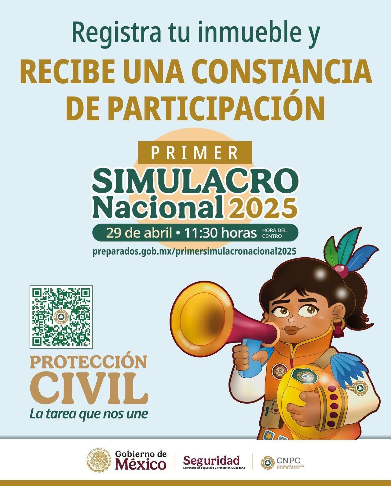 La Coordinación Nacional de Protección Civil (CNPC) de la Secretaría de Seguridad y Protección Ciudadana (SSPC), invita a toda la ciudadanía a participar en el Primer Simulacro Nacional 2025, que se llevará a cabo el martes 29 de abril a las 11:30 horas (tiempo del centro).