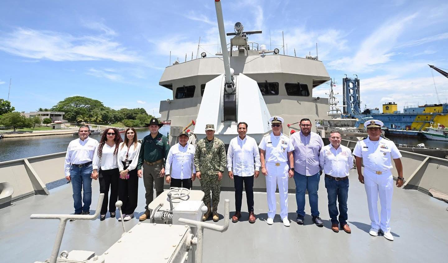 Tuxtla Gutiérrez, Chiapas; 29 de agosto de 2025.El gobernador Eduardo Ramírez Aguilar, acompañado por el comandante de la 22 Zona Naval, Martín Felipe de Jesús Santillán Murillo, y el comandante interino de la VII Región Militar, Alejandro Vargas González, realizó un recorrido por el buque ARM Chiapas, destinado a labores de patrulla oceánica para proteger la seguridad